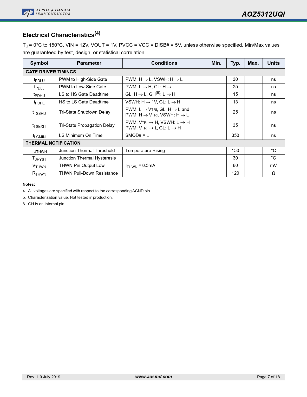 AOZ5312UQIElectrical Characteristics(4) TJ = 0°C to 150°C, VIN = 12V, VOUT = 1V, PVCC = VCC = DISB# = 5V, unless otherwise specified. Min/Max values are guaranteed by test, design, or statistical correlation. SymbolParameterConditionsMin.Typ.Max.UnitsGATE DRIVER TIMINGS tPDLU PWM to High-Side Gate PWM: H L, VSWH: H L 30 ns tPDLL PWM to Low-Side Gate PWM: L H, GL: H L 25 ns tPDHU LS to HS Gate Deadtime GL: H L, GH(6): L H 15 ns tPDHL HS to LS Gate Deadtime VSWH: H 1V, GL: L H 13 ns tTSSHD Tri-State Shutdown Delay PWM: L VTRI, GL: H L and PWM: H VTRI, VSWH: H L 25 ns tTSEXIT Tri-State Propagation Delay PWM: VTRI H, VSWH: L H PWM: VTRI L, GL: L H 35 ns tLGMIN LS Minimum On Time SMOD# = L 350 ns THERMAL NOTIFICATION TJTHWN Junction Thermal Threshold Temperature Rising 150 °C TJHYST Junction Thermal Hysteresis 30 °C VTHWN THWN Pin Output Low ITHWN = 0.5mA 60 mV RTHWN THWN Pull-Down Resistance 120 Ω Notes: 4. All voltages are specified with respect to the corresponding AGND pin. 5. Characterization value. Not tested in production. 6. GH is an internal pin. Rev. 1.0 July 2019 www.aosmd.com Page 7 of 18