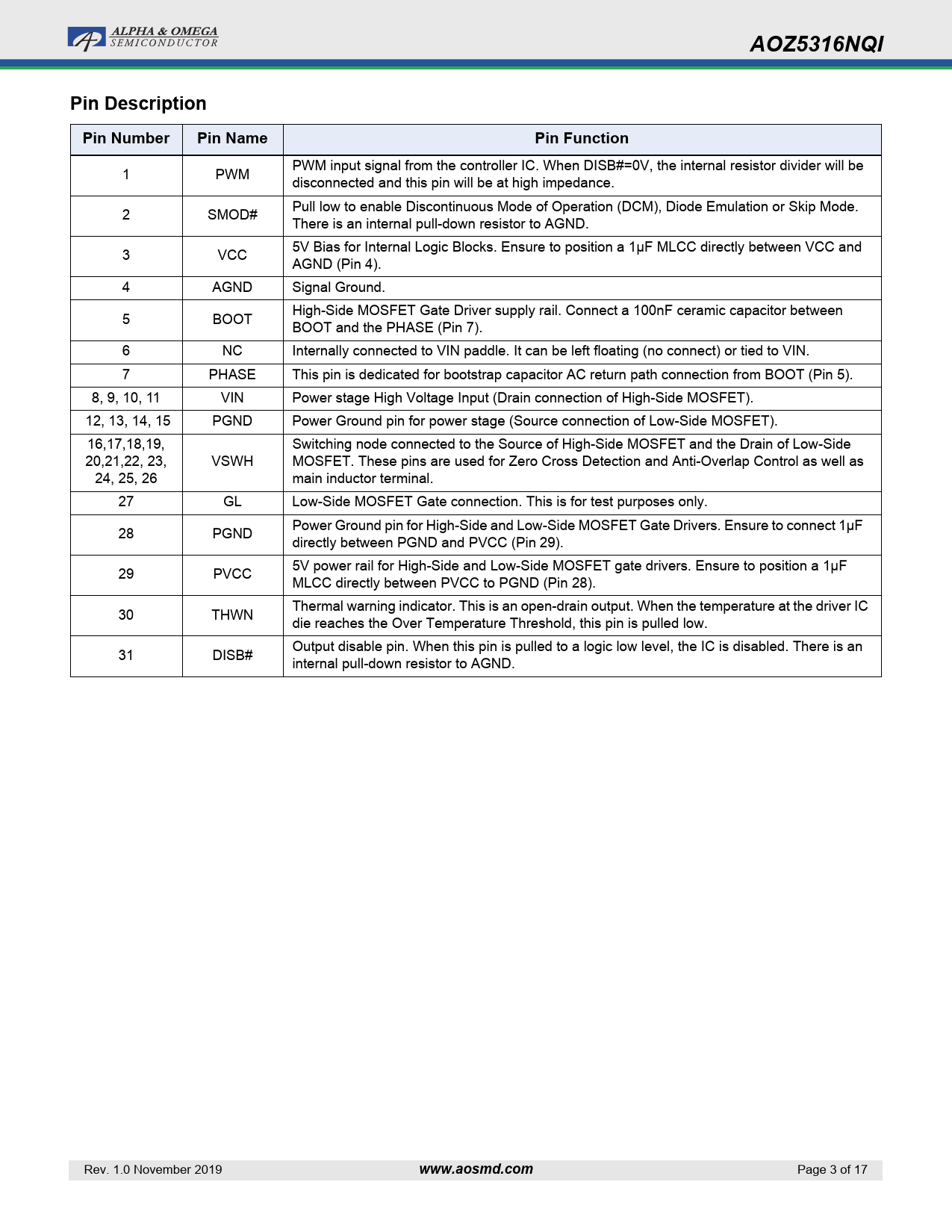 Pages / Page17 / 3 — AOZ5316NQI. Pin Description. Pin Number. Pin Name. Pin Function. …