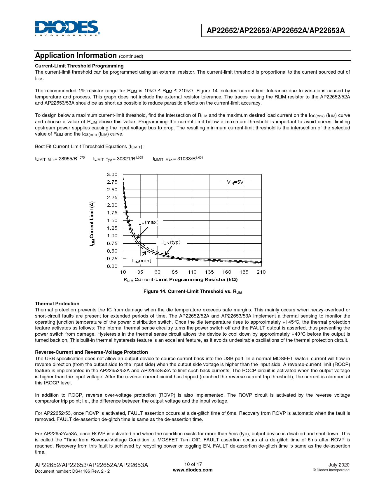 The current-limit threshold can be programmed using an external resistor. The current-limit threshold is proportional to the current sourced out of ILIM. The recommended 1% resistor range for RLIM is 10kΩ ≤ RLIM ≤ 210kΩ. Figure 14 includes current-limit tolerance due to variations caused by temperature and process. This graph does not include the external resistor tolerance. The traces routing the RLIM resistor to the AP22652/52A and AP22653/53A should be as short as possible to reduce parasitic effects on the current-limit accuracy. To design below a maximum current-limit threshold, find the intersection of RLIM and the maximum desired load current on the IOS(max) (ILIM) curve and choose a value of RLIM above this value. Programming the current limit below a maximum threshold is important to avoid current limiting upstream power supplies causing the input voltage bus to drop. The resulting minimum current-limit threshold is the intersection of the selected value of RLIM and the IOS(min) (ILIM) curve. Best Fit Current-Limit Threshold Equations (ILIMIT): ILIMIT_Min = 28955/R1.075 ILIMIT_Typ = 30321/R1.055 ILIMIT_Max = 31033/R1.031