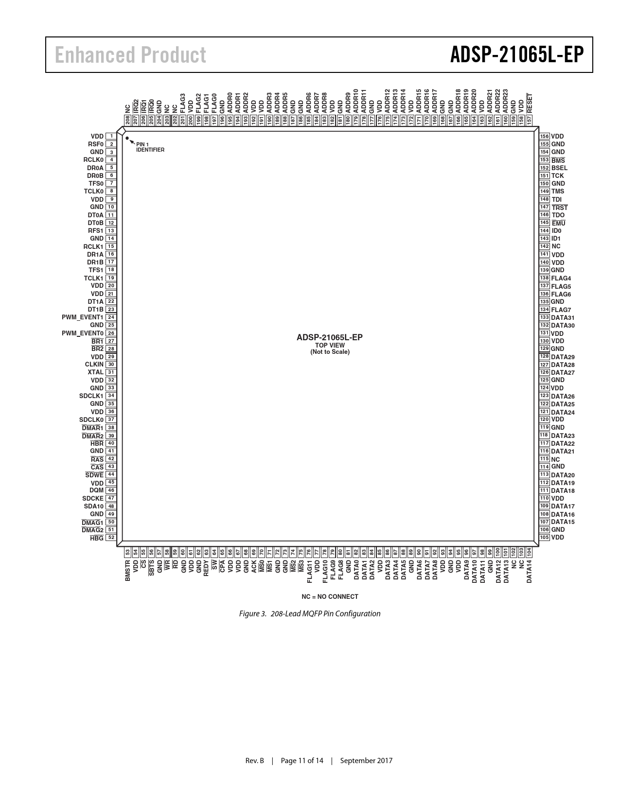 Enhanced Product ADSP-21065L-EP 2 1 0 NC IRQ IRQ IRQ GND NC NC FLAG3 VDD FLAG2 FLAG1 FLAG0 GND ADDR0 ADDR1 ADDR2 VDD VDD ADDR3 ADDR4 ADDR5 GND GND ADDR6 ADDR7 ADDR8 VDD GND ADDR9 ADDR10 ADDR11 GND VDD ADDR12 ADDR13 ADDR14 VDD ADDR15 ADDR16 ADDR17 GND GND ADDR18 ADDR19 ADDR20 VDD ADDR21 ADDR22 ADDR23 GND VDD RESET 208 207 206 205 204 203 202 201 200 199 198 197 196 195 194 193 192 191 190 189 188 187 186 185 184 183 182 181 180 179 178 177 176 175 174 173 172 171 170 169 168 167 166 165 164 163 162 161 160 159 158 157 VDD 1 156 VDD RSF0 2 PIN 1 155 GND IDENTIFIER GND 3 154 GND RCLK0 4 153 BMS DR0A 5 152 BSEL 6 DR0B 151 TCK 7 TFS0 150 GND 8 TCLK0 149 TMS 9 148 VDD TDI GND 10 147 TRST DT0A 11 146 TDO DT0B 12 145 EMU RFS1 13 144 ID0 GND 14 143 ID1 RCLK1 15 142 NC DR1A 16 141 VDD 17 DR1B 140 VDD 18 TFS1 139 GND TCLK1 19 138 FLAG4 VDD 20 137 FLAG5 VDD 21 136 FLAG6 DT1A 22 135 GND DT1B 23 134 FLAG7 PWM EVENT1 24 133 DATA31 GND 25 132 OO DATA30 PWM EVENT0 26 131 VDD ADSP-21065L-EP 27 130 BR1 VDD BR2 TOP VIEW 28 129 GND (Not to Scale) 29 128 VDD DATA29 CLKIN 30 127 DATA28 XTAL 31 126 DATA27 VDD 32 125 GND GND 33 124 VDD SDCLK1 34 123 DATA26 GND 35 122 DATA25 VDD 36 121 DATA24 SDCLK0 37 120 VDD 38 119 DMAR1 GND 39 118 DMAR2 DATA23 40 117 HBR DATA22 GND 41 116 DATA21 42 115 RAS NC 43 114 GND CAS 44 113 SDWE DATA20 45 112 VDD DATA19 DQM 46 111 DATA18 SDCKE 47 110 VDD SDA10 48 109 DATA17 GND 49 108 DATA16 50 107 DMAG1 DATA15 51 106 DMAG2 GND 52 105 HBG VDD 0 1 53 54 55 56 57 58 59 60 61 62 63 64 65 66 67 68 69 70 71 72 73 74 75 76 77 78 79 80 81 82 83 84 85 86 87 88 89 90 91 92 93 94 95 96 97 98 99 10 10 102 103 104 0 1 2 3 CS WR RD SW NC NC VDD SBTS GND GND VDD GND CPA VDD VDD GND ACK MS MS GND GND MS MS VDD GND VDD GND VDD GND VDD GND REDY BMSTR FLAG9 FLAG8 DATA0 DATA1 DATA2 DATA3 DATA4 DATA5 DATA6 DATA7 DATA8 DATA9 FLAG11 FLAG10 DATA10 DATA11 DATA12 DATA13 DATA14 NC = NO CONNECT