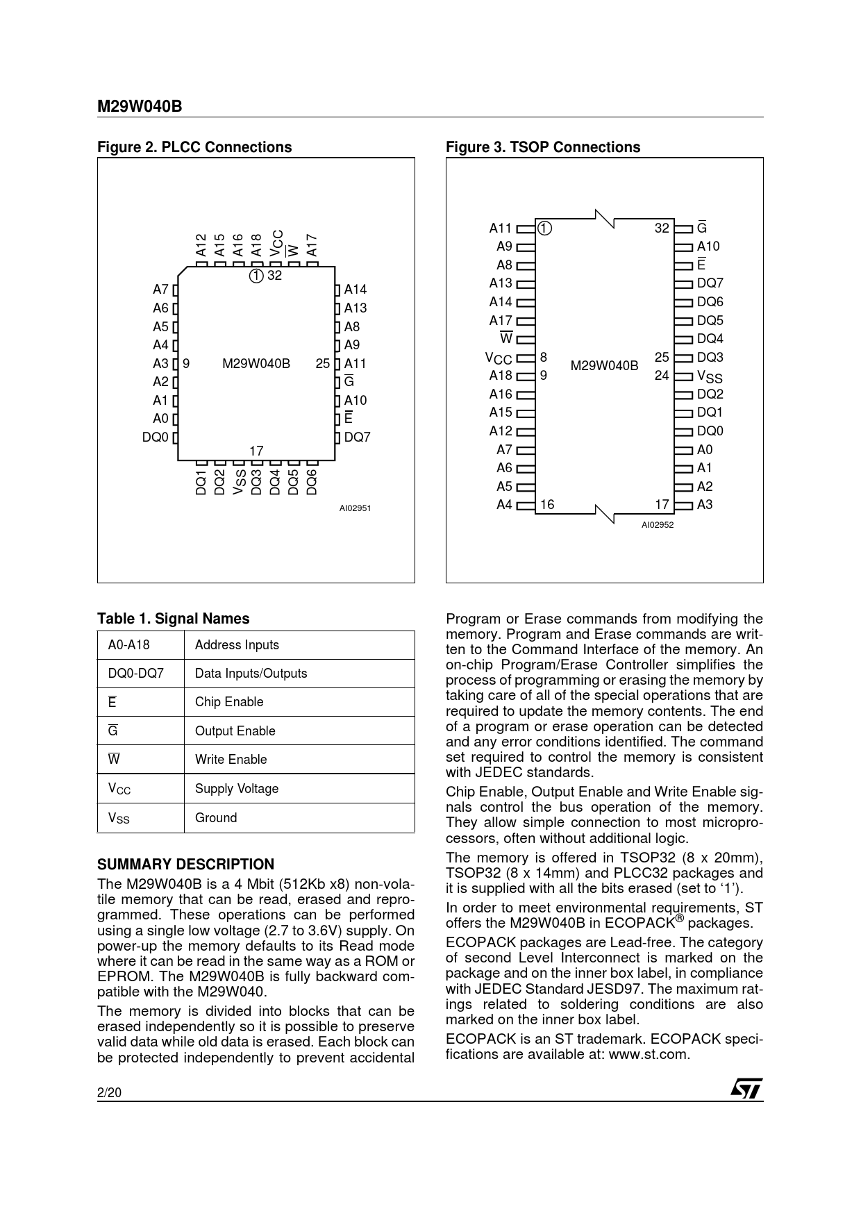 M29W040BFigure 2. PLCC ConnectionsFigure 3. TSOP Connections A11 1 32 G CC A9 A10 A12 A15 A16 A18 V W A17 A8 E 1 32 A13 DQ7 A7 A14 A14 DQ6 A6 A13 A17 DQ5 A5 A8 W DQ4 A4 A9 V 8 25 DQ3 A3 9 M29W040B 25 A11 CC M29W040B A18 9 24 V A2 G SS A16 DQ2 A1 A10 A15 DQ1 A0 E A12 DQ0 DQ0 DQ7 17 A7 A0 A6 A1 SS DQ1 DQ2 V DQ3 DQ4 DQ5 DQ6 A5 A2 AI02951 A4 16 17 A3 AI02952 Table 1. Signal Names Program or Erase commands from modifying the memory. Program and Erase commands are writ- A0-A18 Address Inputs ten to the Command Interface of the memory. An on-chip Program/Erase Controller simplifies the DQ0-DQ7 Data Inputs/Outputs process of programming or erasing the memory by taking care of all of the special operations that are E Chip Enable required to update the memory contents. The end G Output Enable of a program or erase operation can be detected and any error conditions identified. The command W Write Enable set required to control the memory is consistent with JEDEC standards. VCC Supply Voltage Chip Enable, Output Enable and Write Enable sig- nals control the bus operation of the memory. VSS Ground They allow simple connection to most micropro- cessors, often without additional logic. The memory is offered in TSOP32 (8 x 20mm), SUMMARY DESCRIPTION TSOP32 (8 x 14mm) and PLCC32 packages and The M29W040B is a 4 Mbit (512Kb x8) non-vola- it is supplied with all the bits erased (set to ‘1’). tile memory that can be read, erased and repro- In order to meet environmental requirements, ST grammed. These operations can be performed offers the M29W040B in ECOPACK® packages. using a single low voltage (2.7 to 3.6V) supply. On power-up the memory defaults to its Read mode ECOPACK packages are Lead-free. The category where it can be read in the same way as a ROM or of second Level Interconnect is marked on the EPROM. The M29W040B is fully backward com- package and on the inner box label, in compliance patible with the M29W040. with JEDEC Standard JESD97. The maximum rat- ings related to soldering conditions are also The memory is divided into blocks that can be marked on the inner box label. erased independently so it is possible to preserve valid data while old data is erased. Each block can ECOPACK is an ST trademark. ECOPACK speci- be protected independently to prevent accidental fications are available at: www.st.com. 2/20 Document Outline Table 1. Signal Names Table 2. Absolute Maximum Ratings (1) Table 3. Uniform Block Addresses, M29W040B Table 4. Bus Operations Table 5. Commands Read/Reset. Auto Select. Program, Unlock Bypass Program, Chip Erase, Block Erase. Unlock Bypass. Unlock Bypass Reset. Erase Suspend. Erase Resume. Table 6. Program, Erase Times and Program, Erase Endurance Cycles (TA = 0 to 70˚C or –40 to 85˚C) Table 7. Status Register Bits Table 8. AC Measurement Conditions Table 9. Capacitance (TA = 25 ˚C, f = 1 MHz) Table 10. DC Characteristics (TA = 0 to 70˚C or –40 to 85˚C) Table 11. Read AC Characteristics (TA = 0 to 70˚C or –40 to 85˚C) Table 12. Write AC Characteristics, Write Enable Controlled (TA = 0 to 70˚C or –40 to 85˚C) Table 13. Write AC Characteristics, Chip Enable Controlled (TA = 0 to 70˚C or –40 to 85˚C) Table 14. Ordering Information Scheme Table 15. PLCC32 – 32 lead Plastic Leaded Chip Carrier, Package Mechanical Data Table 16. TSOP32 – 32 lead Plastic Thin Small Outline, 8 x 20mm, Package Mechanical Data Table 17. TSOP32 – 32 lead Plastic Thin Small Outline, 8 x 14mm, Package Mechanical Data Table 18. Revision History SUMMARY DESCRIPTION SIGNAL DESCRIPTIONS Address Inputs (A0-A18). Data Inputs/Outputs (DQ0-DQ7). Chip Enable (E). Output Enable (G). Write Enable (W). VCC Supply Voltage. VSS Ground. BUS OPERATIONS Bus Read. Bus Write. Output Disable. Standby. Automatic Standby. Special Bus Operations Electronic Signature. Block Protection and Blocks Unprotection. COMMAND INTERFACE Read/Reset Command. Auto Select Command. Program Command. Unlock Bypass Command. Unlock Bypass Program Command. Unlock Bypass Reset Command. Chip Erase Command. Block Erase Command. Erase Suspend Command. Erase Resume Command. STATUS REGISTER Data Polling Bit (DQ7). Toggle Bit (DQ6). Error Bit (DQ5). Erase Timer Bit (DQ3). Alternative Toggle Bit (DQ2). Figure 1. Logic Diagram Figure 2. PLCC Connections Figure 3. TSOP Connections Figure 4. Data Polling Flowchart Figure 5. Data Toggle Flowchart Figure 6. AC Testing Input Output Waveform Figure 7. AC Testing Load Circuit Figure 8. Read Mode AC Waveforms Figure 9. Write AC Waveforms, Write Enable Controlled Figure 10. Write AC Waveforms, Chip Enable Controlled Figure 11. PLCC32 – 32 lead Plastic Leaded Chip Carrier, Package Outline Figure 12. TSOP32 – 32 lead Plastic Thin Small Outline, 8 x 20mm, Package Outline Figure 13. TSOP32 – 32 lead Plastic Thin Small Outline, 8 x 14mm, Package Outline