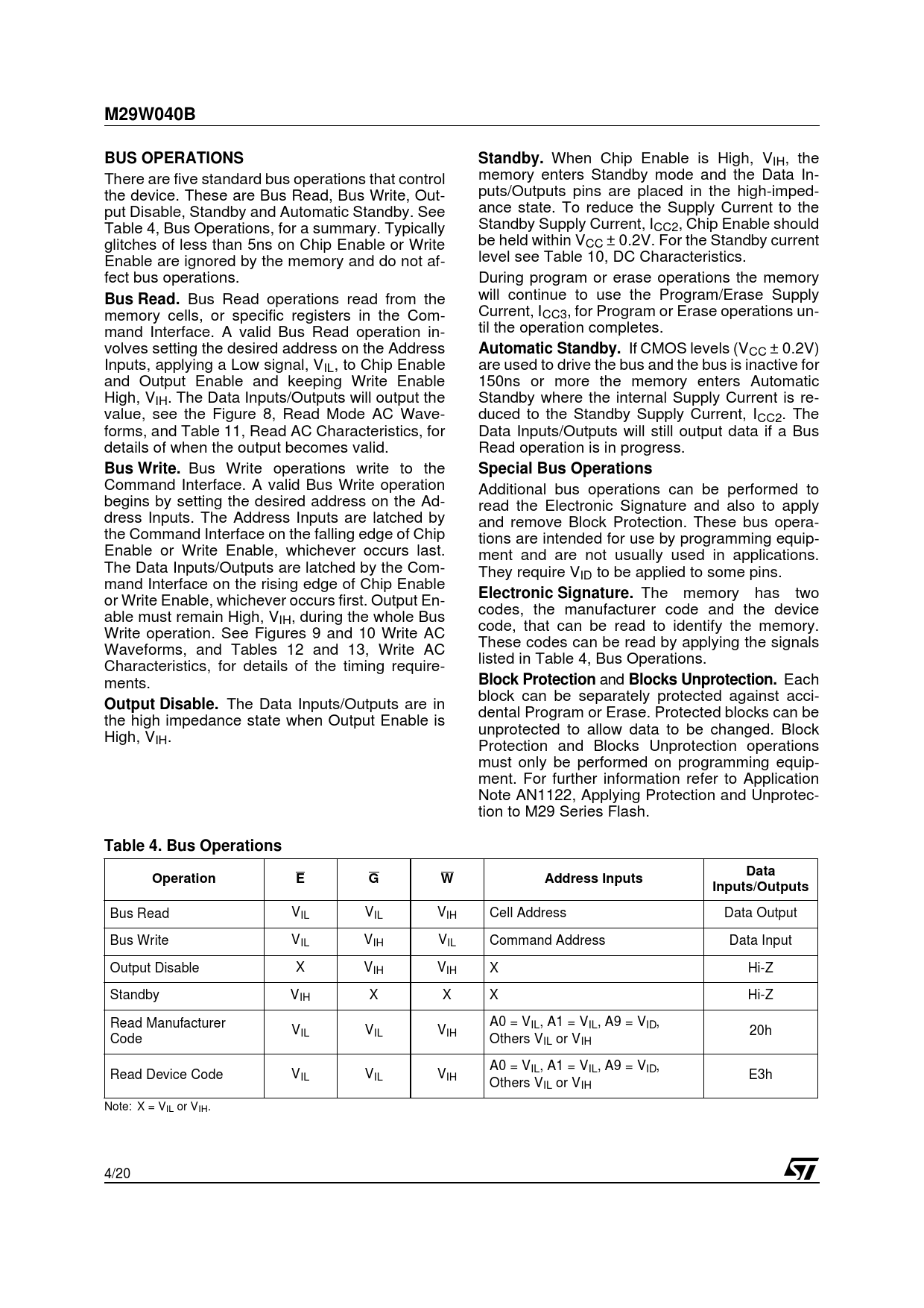 link to page 12 link to page 12 link to page 13 link to page 14 link to page 13 link to page 14 link to page 11 M29W040BBUS OPERATIONSStandby. When Chip Enable is High, VIH, the There are five standard bus operations that control memory enters Standby mode and the Data In- the device. These are Bus Read, Bus Write, Out- puts/Outputs pins are placed in the high-imped- put Disable, Standby and Automatic Standby. See ance state. To reduce the Supply Current to the Table 4, Bus Operations, for a summary. Typically Standby Supply Current, ICC2, Chip Enable should glitches of less than 5ns on Chip Enable or Write be held within VCC ± 0.2V. For the Standby current Enable are ignored by the memory and do not af- level see Table 10, DC Characteristics. fect bus operations. During program or erase operations the memory Bus Read. Bus Read operations read from the will continue to use the Program/Erase Supply memory cells, or specific registers in the Com- Current, ICC3, for Program or Erase operations un- mand Interface. A valid Bus Read operation in- til the operation completes. volves setting the desired address on the Address Automatic Standby. If CMOS levels (VCC ± 0.2V) Inputs, applying a Low signal, VIL, to Chip Enable are used to drive the bus and the bus is inactive for and Output Enable and keeping Write Enable 150ns or more the memory enters Automatic High, VIH. The Data Inputs/Outputs will output the Standby where the internal Supply Current is re- value, see the Figure 8, Read Mode AC Wave- duced to the Standby Supply Current, ICC2. The forms, and Table 11, Read AC Characteristics, for Data Inputs/Outputs will still output data if a Bus details of when the output becomes valid. Read operation is in progress. Bus Write. Bus Write operations write to the Special Bus Operations Command Interface. A valid Bus Write operation Additional bus operations can be performed to begins by setting the desired address on the Ad- read the Electronic Signature and also to apply dress Inputs. The Address Inputs are latched by and remove Block Protection. These bus opera- the Command Interface on the falling edge of Chip tions are intended for use by programming equip- Enable or Write Enable, whichever occurs last. ment and are not usually used in applications. The Data Inputs/Outputs are latched by the Com- They require VID to be applied to some pins. mand Interface on the rising edge of Chip Enable Electronic Signature. The memory has two or Write Enable, whichever occurs first. Output En- codes, the manufacturer code and the device able must remain High, VIH, during the whole Bus code, that can be read to identify the memory. Write operation. See Figures 9 and 10 Write AC These codes can be read by applying the signals Waveforms, and Tables 12 and 13, Write AC listed in Table 4, Bus Operations. Characteristics, for details of the timing require- ments. Block Protection and Blocks Unprotection. Each block can be separately protected against acci- Output Disable. The Data Inputs/Outputs are in dental Program or Erase. Protected blocks can be the high impedance state when Output Enable is unprotected to allow data to be changed. Block High, VIH. Protection and Blocks Unprotection operations must only be performed on programming equip- ment. For further information refer to Application Note AN1122, Applying Protection and Unprotec- tion to M29 Series Flash. Table 4. Bus OperationsDataOperationEGWAddress InputsInputs/Outputs Bus Read VIL VIL VIH Cell Address Data Output Bus Write VIL VIH VIL Command Address Data Input Output Disable X VIH VIH X Hi-Z Standby VIH X X X Hi-Z Read Manufacturer A0 = V V IL, A1 = VIL, A9 = VID, 20h Code IL VIL VIH Others VIL or VIH A0 = VIL, A1 = VIL, A9 = VID, Read Device Code VIL VIL VIH E3h Others VIL or VIH Note: X = VIL or VIH. 4/20 Document Outline Table 1. Signal Names Table 2. Absolute Maximum Ratings (1) Table 3. Uniform Block Addresses, M29W040B Table 4. Bus Operations Table 5. Commands Read/Reset. Auto Select. Program, Unlock Bypass Program, Chip Erase, Block Erase. Unlock Bypass. Unlock Bypass Reset. Erase Suspend. Erase Resume. Table 6. Program, Erase Times and Program, Erase Endurance Cycles (TA = 0 to 70˚C or –40 to 85˚C) Table 7. Status Register Bits Table 8. AC Measurement Conditions Table 9. Capacitance (TA = 25 ˚C, f = 1 MHz) Table 10. DC Characteristics (TA = 0 to 70˚C or –40 to 85˚C) Table 11. Read AC Characteristics (TA = 0 to 70˚C or –40 to 85˚C) Table 12. Write AC Characteristics, Write Enable Controlled (TA = 0 to 70˚C or –40 to 85˚C) Table 13. Write AC Characteristics, Chip Enable Controlled (TA = 0 to 70˚C or –40 to 85˚C) Table 14. Ordering Information Scheme Table 15. PLCC32 – 32 lead Plastic Leaded Chip Carrier, Package Mechanical Data Table 16. TSOP32 – 32 lead Plastic Thin Small Outline, 8 x 20mm, Package Mechanical Data Table 17. TSOP32 – 32 lead Plastic Thin Small Outline, 8 x 14mm, Package Mechanical Data Table 18. Revision History SUMMARY DESCRIPTION SIGNAL DESCRIPTIONS Address Inputs (A0-A18). Data Inputs/Outputs (DQ0-DQ7). Chip Enable (E). Output Enable (G). Write Enable (W). VCC Supply Voltage. VSS Ground. BUS OPERATIONS Bus Read. Bus Write. Output Disable. Standby. Automatic Standby. Special Bus Operations Electronic Signature. Block Protection and Blocks Unprotection. COMMAND INTERFACE Read/Reset Command. Auto Select Command. Program Command. Unlock Bypass Command. Unlock Bypass Program Command. Unlock Bypass Reset Command. Chip Erase Command. Block Erase Command. Erase Suspend Command. Erase Resume Command. STATUS REGISTER Data Polling Bit (DQ7). Toggle Bit (DQ6). Error Bit (DQ5). Erase Timer Bit (DQ3). Alternative Toggle Bit (DQ2). Figure 1. Logic Diagram Figure 2. PLCC Connections Figure 3. TSOP Connections Figure 4. Data Polling Flowchart Figure 5. Data Toggle Flowchart Figure 6. AC Testing Input Output Waveform Figure 7. AC Testing Load Circuit Figure 8. Read Mode AC Waveforms Figure 9. Write AC Waveforms, 
