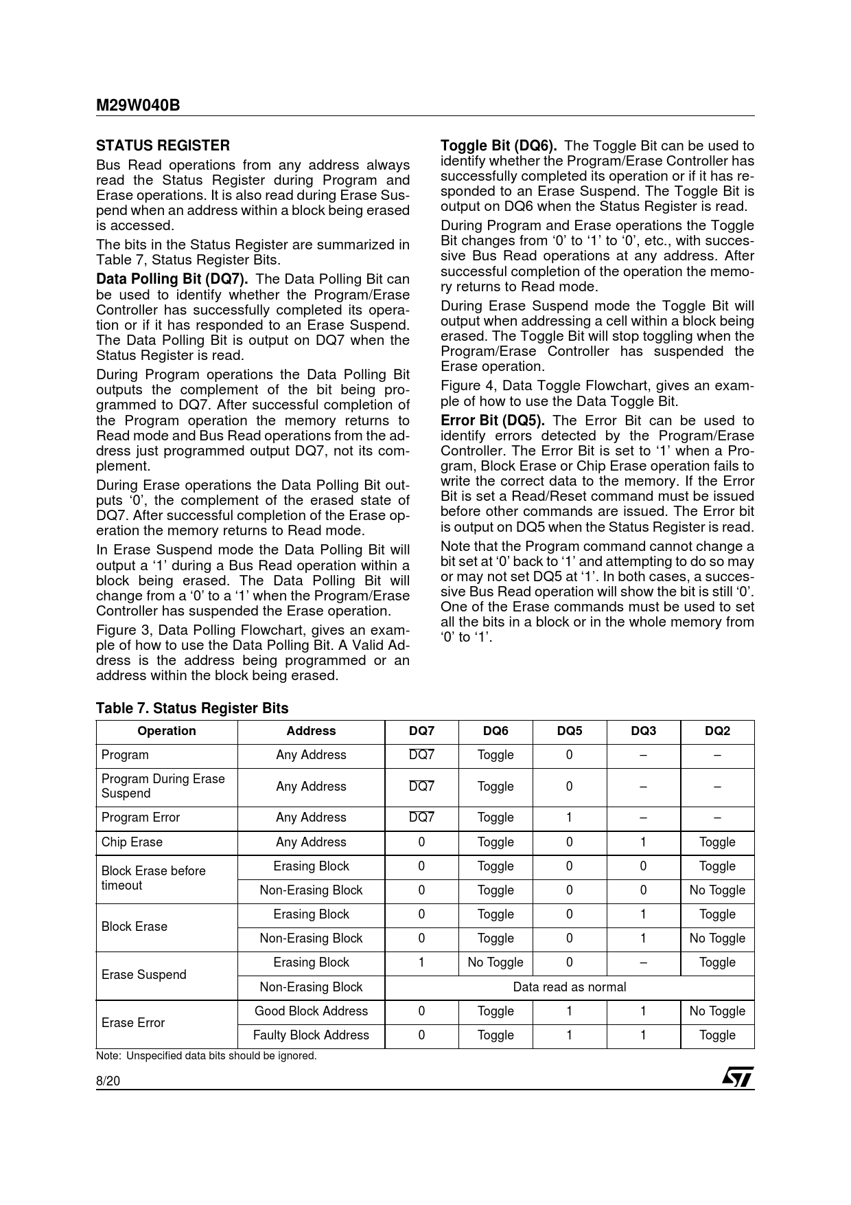 M29W040BSTATUS REGISTERToggle Bit (DQ6). The Toggle Bit can be used to Bus Read operations from any address always identify whether the Program/Erase Controller has read the Status Register during Program and successfully completed its operation or if it has re- Erase operations. It is also read during Erase Sus- sponded to an Erase Suspend. The Toggle Bit is pend when an address within a block being erased output on DQ6 when the Status Register is read. is accessed. During Program and Erase operations the Toggle The bits in the Status Register are summarized in Bit changes from ‘0’ to ‘1’ to ‘0’, etc., with succes- Table 7, Status Register Bits. sive Bus Read operations at any address. After successful completion of the operation the memo- Data Polling Bit (DQ7). The Data Polling Bit can ry returns to Read mode. be used to identify whether the Program/Erase Controller has successfully completed its opera- During Erase Suspend mode the Toggle Bit will tion or if it has responded to an Erase Suspend. output when addressing a cell within a block being The Data Polling Bit is output on DQ7 when the erased. The Toggle Bit will stop toggling when the Status Register is read. Program/Erase Controller has suspended the Erase operation. During Program operations the Data Polling Bit outputs the complement of the bit being pro- Figure 4, Data Toggle Flowchart, gives an exam- grammed to DQ7. After successful completion of ple of how to use the Data Toggle Bit. the Program operation the memory returns to Error Bit (DQ5). The Error Bit can be used to Read mode and Bus Read operations from the ad- identify errors detected by the Program/Erase dress just programmed output DQ7, not its com- Controller. The Error Bit is set to ‘1’ when a Pro- plement. gram, Block Erase or Chip Erase operation fails to During Erase operations the Data Polling Bit out- write the correct data to the memory. If the Error puts ‘0’, the complement of the erased state of Bit is set a Read/Reset command must be issued DQ7. After successful completion of the Erase op- before other commands are issued. The Error bit eration the memory returns to Read mode. is output on DQ5 when the Status Register is read. In Erase Suspend mode the Data Polling Bit will Note that the Program command cannot change a output a ‘1’ during a Bus Read operation within a bit set at ‘0’ back to ‘1’ and attempting to do so may block being erased. The Data Polling Bit will or may not set DQ5 at ‘1’. In both cases, a succes- change from a ‘0’ to a ‘1’ when the Program/Erase sive Bus Read operation will show the bit is still ‘0’. Controller has suspended the Erase operation. One of the Erase commands must be used to set all the bits in a block or in the whole memory from Figure 3, Data Polling Flowchart, gives an exam- ‘0’ to ‘1’. ple of how to use the Data Polling Bit. A Valid Ad- dress is the address being programmed or an address within the block being erased. Table 7. Status Register BitsOperationAddressDQ7DQ6DQ5DQ3DQ2 Program Any Address DQ7 Toggle 0 – – Program During Erase Any Address DQ7 Toggle 0 – – Suspend Program Error Any Address DQ7 Toggle 1 – – Chip Erase Any Address 0 Toggle 0 1 Toggle Block Erase before Erasing Block 0 Toggle 0 0 Toggle timeout Non-Erasing Block 0 Toggle 0 0 No Toggle Erasing Block 0 Toggle 0 1 Toggle Block Erase Non-Erasing Block 0 Toggle 0 1 No Toggle Erasing Block 1 No Toggle 0 – Toggle Erase Suspend Non-Erasing Block Data read as normal Good Block Address 0 Toggle 1 1 No Toggle Erase Error Faulty Block Address 0 Toggle 1 1 Toggle Note: Unspecified data bits should be ignored. 8/20 Document Outline Table 1. Signal Names Table 2. Absolute Maximum Ratings (1) Table 3. Uniform Block Addresses, M29W040B Table 4. Bus Operations Table 5. Commands Read/Reset. Auto Select. Program, Unlock Bypass Program, Chip Erase, Block Erase. Unlock Bypass. Unlock Bypass Reset. Erase Suspend. Erase Resume. Table 6. Program, Erase Times and Program, Erase Endurance Cycles (TA = 0 to 70˚C or –40 to 85˚C) Table 7. Status Register Bits Table 8. AC Measurement Conditions Table 9. Capacitance (TA = 25 ˚C, f = 1 MHz) Table 10. DC Characteristics (TA = 0 to 70˚C or –40 to 85˚C) Table 11. Read AC Characteristics (TA = 0 to 70˚C or –40 to 85˚C) Table 12. Write AC Characteristics, Write Enable Controlled (TA = 0 to 70˚C or –40 to 85˚C) Table 13. Write AC Characteristics, Chip Enable Controlled (TA = 0 to 70˚C or –40 to 85˚C) Table 14. Ordering Information Scheme Table 15. PLCC32 – 32 lead Plastic Leaded Chip Carrier, Package Mechanical Data Table 16. TSOP32 – 32 lead Plastic Thin Small Outline, 8 x 20mm, Package Mechanical Data Table 17. TSOP32 – 32 lead Plastic Thin Small Outline, 8 x 14mm, Package Mechanical Data Table 18. Revision History SUMMARY DESCRIPTION SIGNAL DESCRIPTIONS Address Inputs (A0-A18). Data Inputs/Outputs (DQ0-DQ7). Chip Enable (E). Output Enable (G). Write Enable (W). VCC Supply Voltage. VSS Ground. BUS OPERATIONS Bus Read. Bus Write. Output Disable. Standby. Automatic Standby. Special Bus Operations Electronic Signature. Block Protection and Blocks Unprotection. COMMAND INTERFACE Read/Reset Command. Auto Select Command. Program Command. Unlock Bypass Command. Unlock Bypass Program Command. Unlock Bypass Reset Command. Chip Erase Command. Block Erase Command. Erase Suspend Command. Erase Resume Command. STATUS REGISTER Data Polling Bit (DQ7). Toggle Bit (DQ6). Error Bit (DQ5). Erase Timer Bit (DQ3). Alternative Toggle Bit (DQ2). Figure 1. Logic Diagram Figure 2. PLCC Connections Figure 3. TSOP Connections Figure 4. Data Polling Flowchart Figure 5. Data Toggle Flowchart Figure 6. AC Testing Input Output Waveform Figure 7. AC Testing Load Circuit Figure 8. Read Mode AC Waveforms Figure 9. Write AC Waveforms, Write Enable Controlled Figure 10. Write AC Waveforms, Chip Enable Controlled Figure 11. PLCC32 – 32 lead Plastic Leaded Chip Carrier
