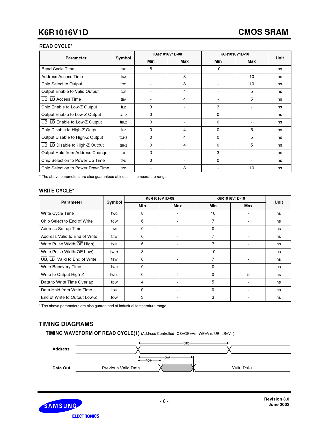 for AT&T. K6R1016V1D. CMOS SRAM. READ CYCLE*. K6R1016V1D-08. K6R1016V1D-10. Parameter. Symbol. Unit. Min. Max. WRITE CYCLE*