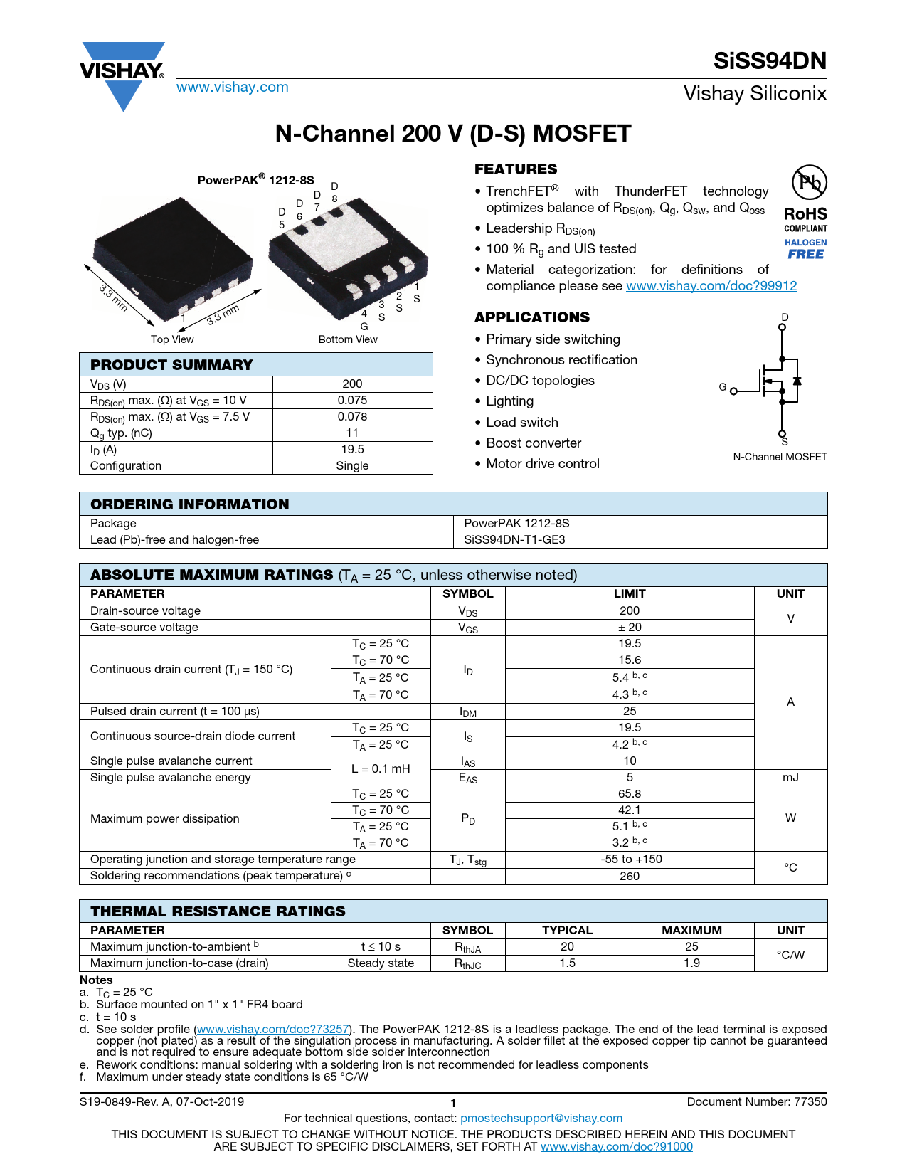 SiSS94DN. N-Channel 200 V (D-S) MOSFET. FEATURES. PowerPAK® 1212-8S. APPLICATIONS. PRODUCT SUMMARY. ORDERING INFORMATION