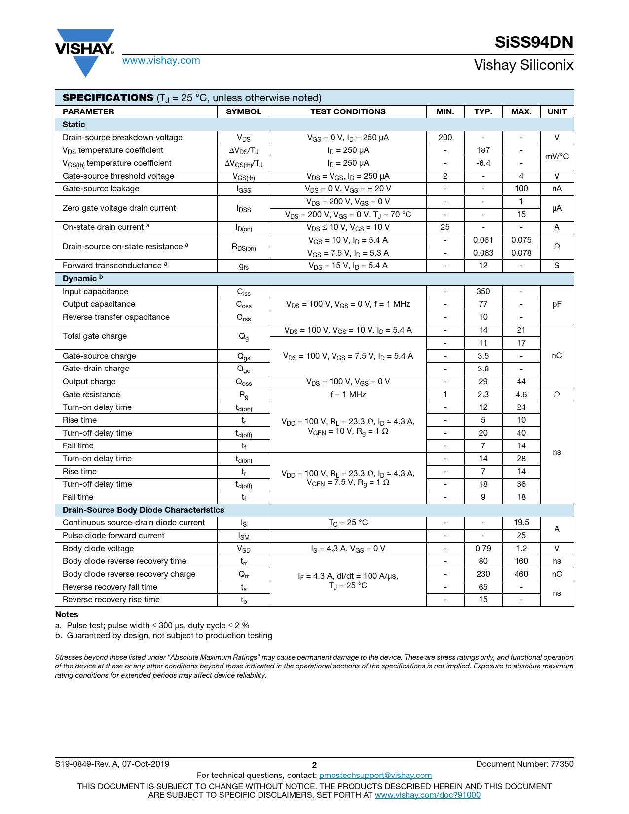 SiSS94DN. SPECIFICATIONS. PARAMETER. SYMBOL TEST. CONDITIONS MIN. TYP. MAX. UNIT. Static. Dynamic b