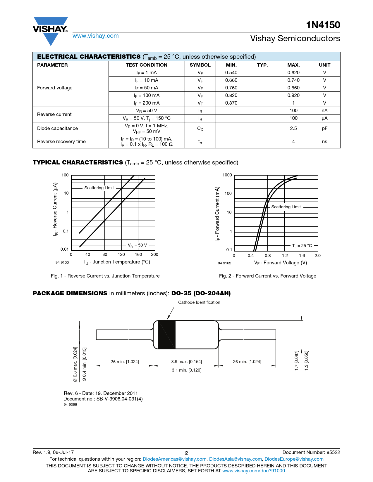 1N4150 www.vishay.com Vishay Semiconductors ELECTRICAL CHARACTERISTICS (Tamb = 25 °C, unless otherwise specified) PARAMETERTEST CONDITIONSYMBOLMIN.TYP.MAX.UNIT IF = 1 mA VF 0.540 0.620 V IF = 10 mA VF 0.660 0.740 V Forward voltage IF = 50 mA VF 0.760 0.860 V IF = 100 mA VF 0.820 0.920 V IF = 200 mA VF 0.870 1 V VR = 50 V IR 100 nA Reverse current VR = 50 V, Tj = 150 °C IR 100 μA V Diode capacitance R = 0 V, f = 1 MHz, C V D 2.5 pF HF = 50 mV I Reverse recovery time F = IR = (10 to 100) mA, iR = 0.1 x IR, RL = 100 Ω trr 4 ns TYPICAL CHARACTERISTICS (Tamb = 25 °C, unless otherwise specified) 100 1000 Scattering Limit 10 100 Scattering Limit 1 10 - Reverse Current (µA) 0.1 1 I R - Forward Current (mA) I F V = 50 V R T = 25 °C J 0.01 0.1 0 40 80 120 160 200 0 0.4 0.8 1.2 1.6 2.0 94 9100 TJ - Junction Temperature (°C) 94 9162 VF - Forward Voltage (V) Fig. 1 - Reverse Current vs. Junction Temperature Fig. 2 - Forward Current vs. Forward Voltage PACKAGE DIMENSIONS in millimeters (inches): DO-35 (DO-204AH) Cathode Identification ] ] 24] 7 0 .0 .015] 6 5 [0 .0 .0 [0 26 min. [1.024] 3.9 max. [0.154] 26 min. [1.024] 0 0 x. [ [ a in. 7 3 1. 1. 3.1 min. [0.120] 6 m 4 m 0. 0. Ø Ø Rev. 6 - Date: 19. December 2011 Document no.: SB-V-3906.04-031(4) 94 9366 Rev. 1.9, 06-Jul-17 2 Document Number: 85522 For technical questions within your region: DiodesAmericas@vishay.com, DiodesAsia@vishay.com, DiodesEurope@vishay.com THIS DOCUMENT IS SUBJECT TO CHANGE WITHOUT NOTICE. THE PRODUCTS DESCRIBED HEREIN AND THIS DOCUMENT ARE SUBJECT TO SPECIFIC DISCLAIMERS, SET FORTH AT www.vishay.com/doc?91000