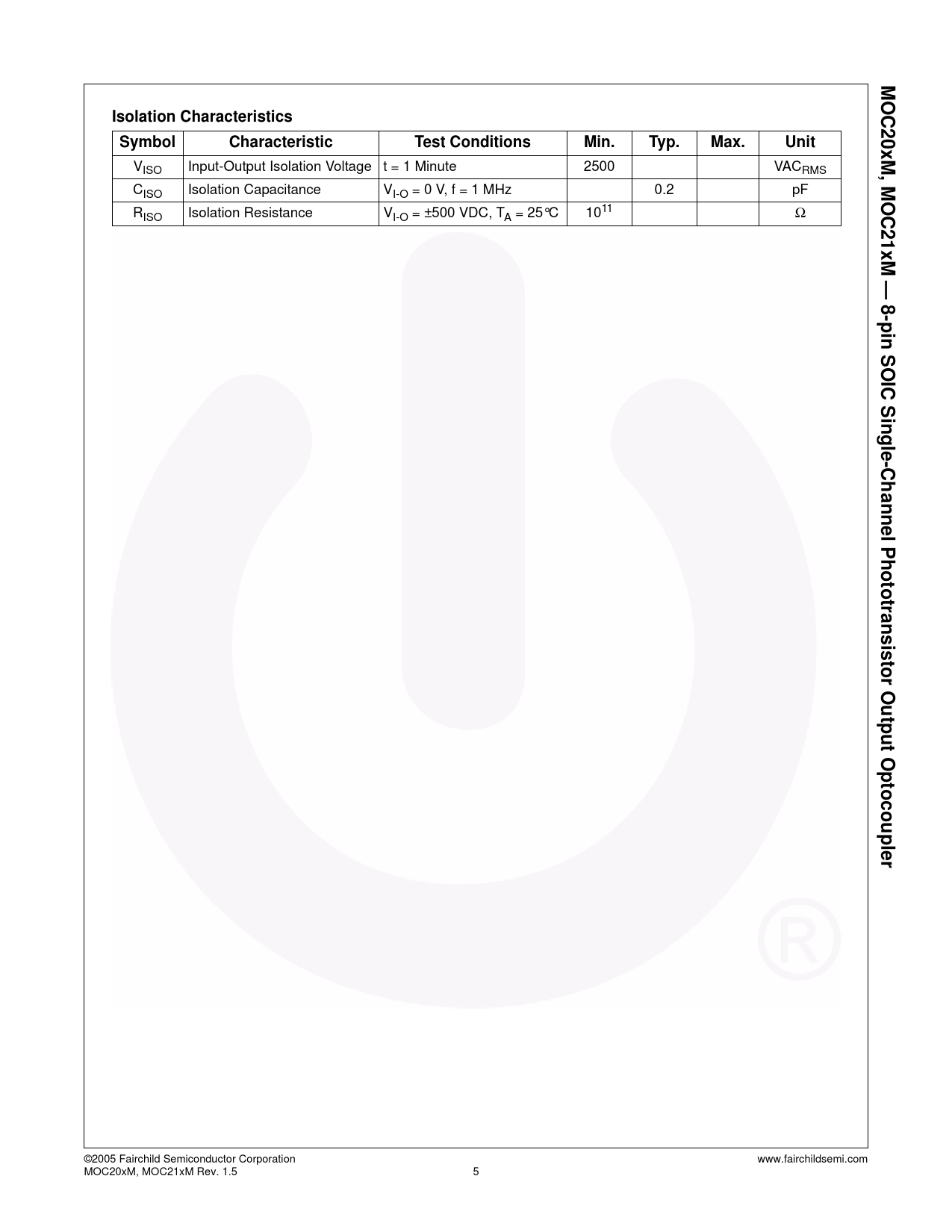 5 MOC20xM, MOC21xM — 8-pin SOIC Single-Channel Phototransistor Output Optocoupler Isolation Characteristics