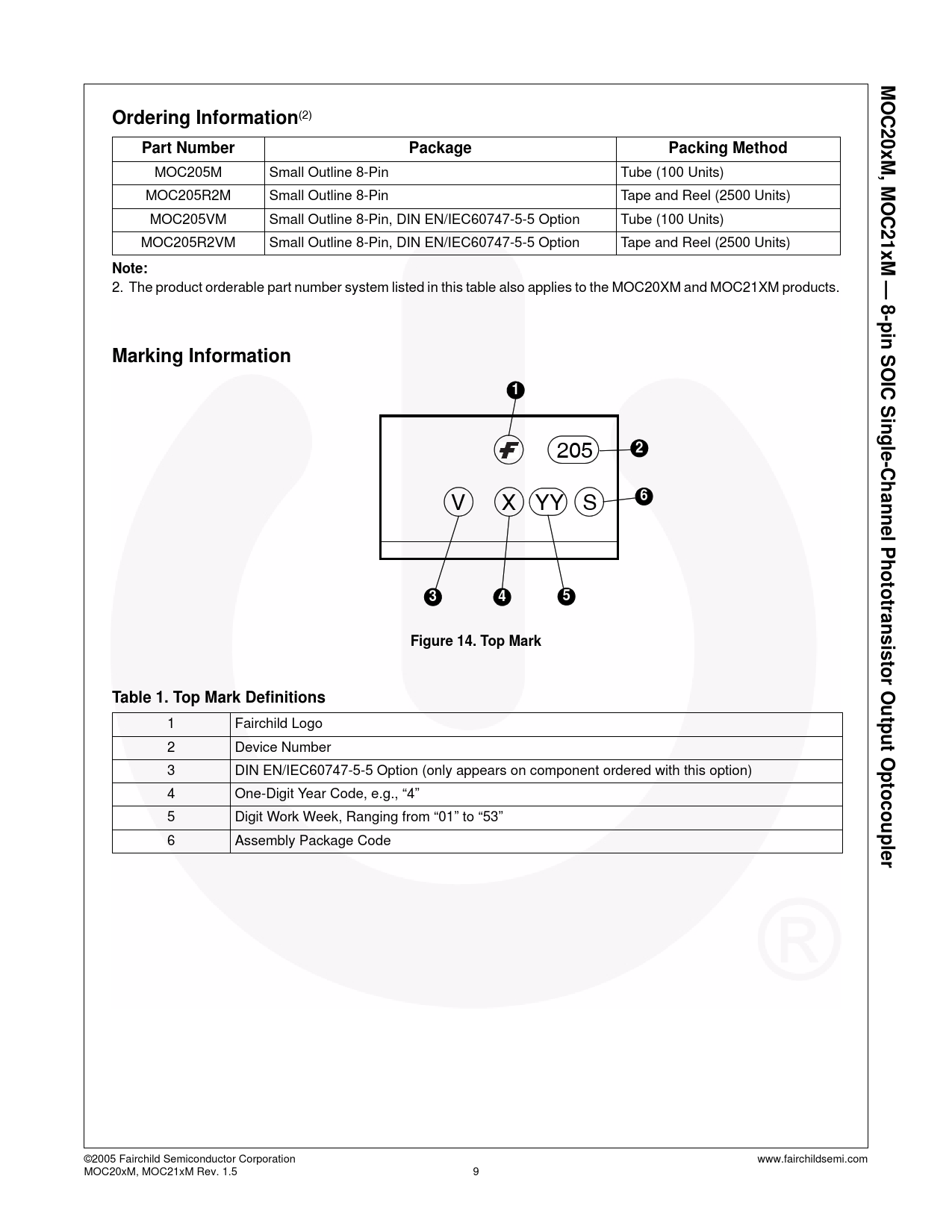 Part Number Package Packing Method MOC205M Small Outline 8-Pin Tube (100 Units) MOC205R2M Small Outline 8-Pin Tape and Reel (2500 Units) MOC205VM Small Outline 8-Pin, DIN EN/IEC60747-5-5 Option Tube (100 Units) MOC205R2VM Small Outline 8-Pin, DIN EN/IEC60747-5-5 Option Tape and Reel (2500 Units) Note: