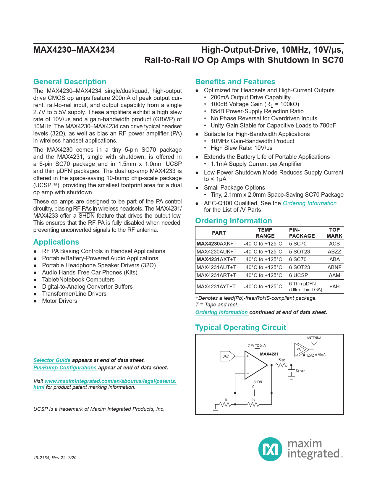 DescriptionHigh-Output-Drive, 10MHz, 10V/µs, Rail-to-Rail I/O Op Amps with Shutdown in SC70