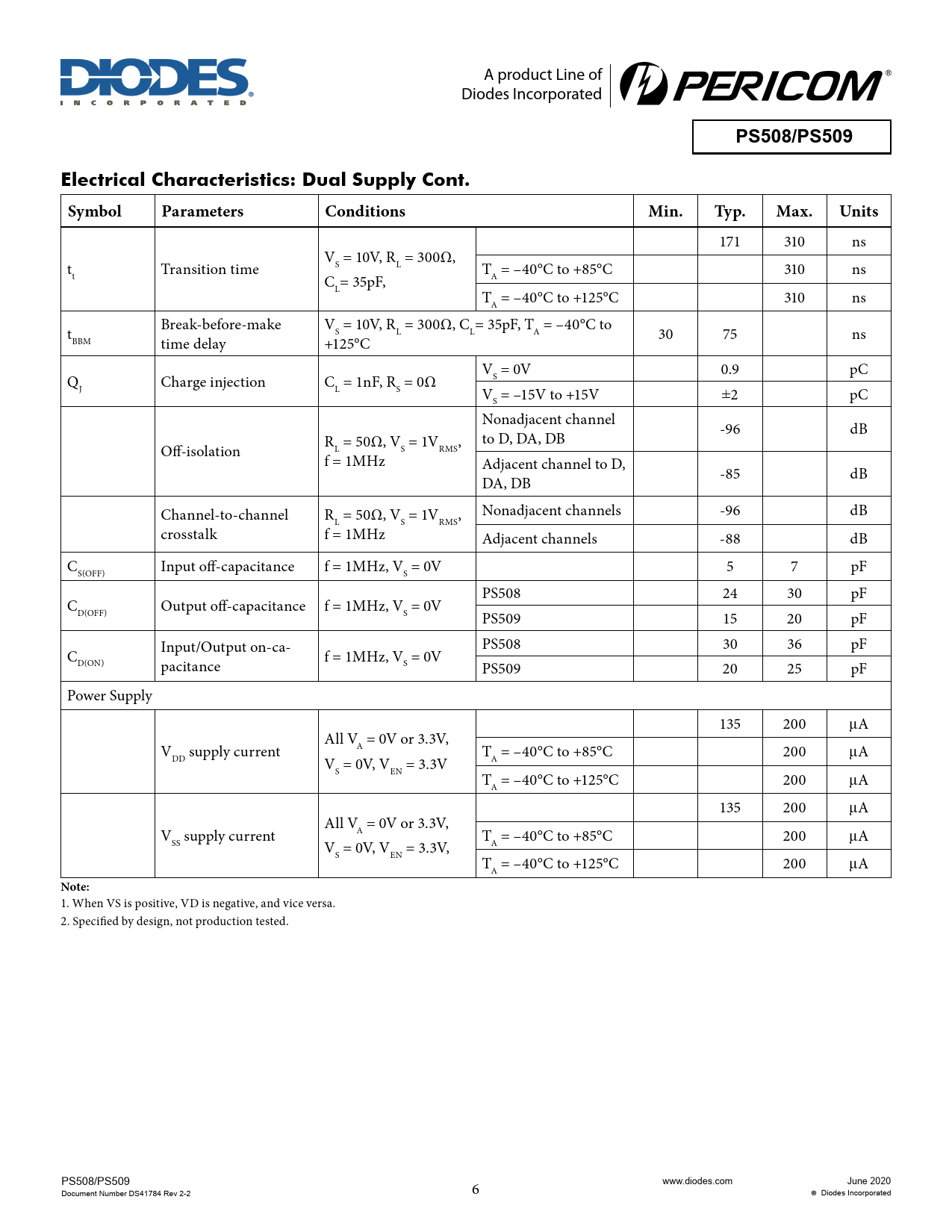 A product Line of Diodes Incorporated PS508/PS509Electrical Characteristics: Dual Supply Cont.SymbolParametersConditionsMin.Typ.Max.Units 171 310 ns V = 10V, R = 300Ω, t Transition time S L T = –40°C to +85°C 310 ns t C = 35pF, A L T = –40°C to +125°C 310 ns A t Break-before-make V = 10V, R = 300Ω, C = 35pF, T = –40°C to S L L A BBM time delay +125°C 30 75 ns V = 0V 0.9 pC Q Charge injection C = 1nF, R = 0Ω S J L S V = –15V to +15V ±2 pC S Nonadjacent channel to D, DA, DB -96 dB Off-isolation R = 50Ω, V = 1V , L S RMS f = 1MHz Adjacent channel to D, DA, DB -85 dB Channel-to-channel R = 50Ω, V = 1V , Nonadjacent channels -96 dB L S RMS crosstalk f = 1MHz Adjacent channels -88 dB C Input off-capacitance f = 1MHz, V = 0V 5 7 pF S(OFF) S PS508 24 30 pF C Output off-capacitance f = 1MHz, V = 0V D(OFF) S PS509 15 20 pF PS508 30 36 pF C Input/Output on-ca- = 0V D(ON) pacitance f = 1MHz, VS PS509 20 25 pF Power Supply 135 200 μA All V = 0V or 3.3V, V supply current A T = –40°C to +85°C 200 μA DD V = 0V, V = 3.3V A S EN T = –40°C to +125°C 200 μA A 135 200 μA All V = 0V or 3.3V, V supply current A T = –40°C to +85°C 200 μA SS V = 0V, V = 3.3V, A S EN T = –40°C to +125°C 200 μA A Note: 1. When VS is positive, VD is negative, and vice versa. 2. Specified by design, not production tested. PS508/PS509 Document Number DS41784 Rev 2-2 6 www.diodes.com June 2020 Diodes Incorporated