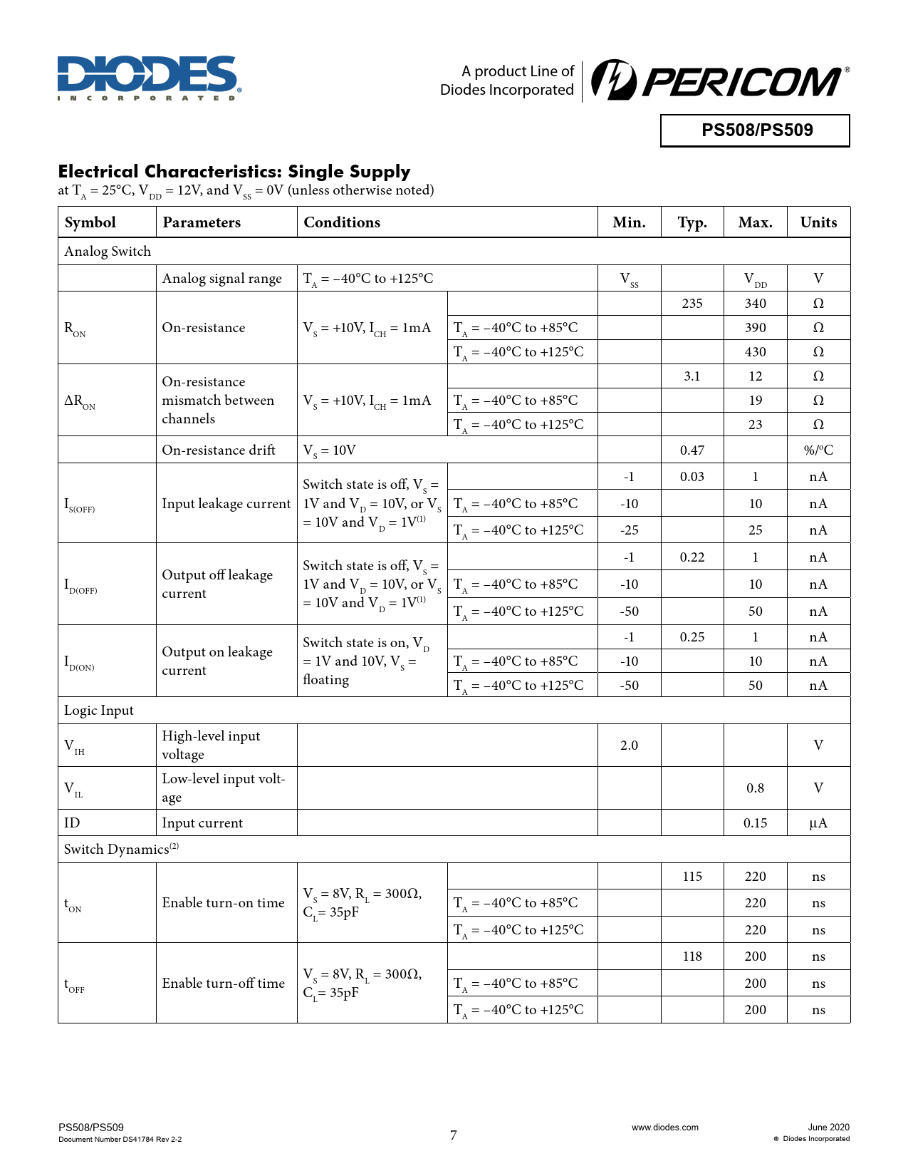 Analog Switch Analog signal range T = –40°C to +125°C V V V A SS DD 235 340 Ω R On-resistance V = +10V, I = 1mA T = –40°C to +85°C 390 Ω ON S CH A T = –40°C to +125°C 430 Ω A On-resistance 3.1 12 Ω ∆R mismatch between V = +10V, I = 1mA T = –40°C to +85°C 19 Ω ON S CH A channels T = –40°C to +125°C 23 Ω A On-resistance drift V = 10V 0.47 %/oC S Switch state is off, V = -1 0.03 1 nA S I Input leakage current 1V and V = 10V, or V T = –40°C to +85°C -10 10 nA S(OFF) D S A = 10V and V = 1V(1) D T = –40°C to +125°C -25 25 nA A Switch state is off, V = -1 0.22 1 nA S I Output off leakage 1V and V = 10V, or V T = –40°C to +85°C -10 10 nA D(OFF) current D S A = 10V and V = 1V(1) D T = –40°C to +125°C -50 50 nA A Switch state is on, V -1 0.25 1 nA D I Output on leakage = 1V and 10V, V = T = –40°C to +85°C -10 10 nA D(ON) current S A floating T = –40°C to +125°C -50 50 nA A Logic Input V High-level input IH voltage 2.0 V V Low-level input volt- IL age 0.8 V ID Input current 0.15 μA Switch Dynamics(2) 115 220 ns t Enable turn-on time V = 8V, R = 300Ω, S L T = –40°C to +85°C 220 ns ON C = 35pF A L T = –40°C to +125°C 220 ns A 118 200 ns t Enable turn-off time V = 8V, R = 300Ω, S L T = –40°C to +85°C 200 ns OFF C = 35pF A L T = –40°C to +125°C 200 ns A PS508/PS509 Document Number DS41784 Rev 2-2 7 www.diodes.com June 2020 Diodes Incorporated