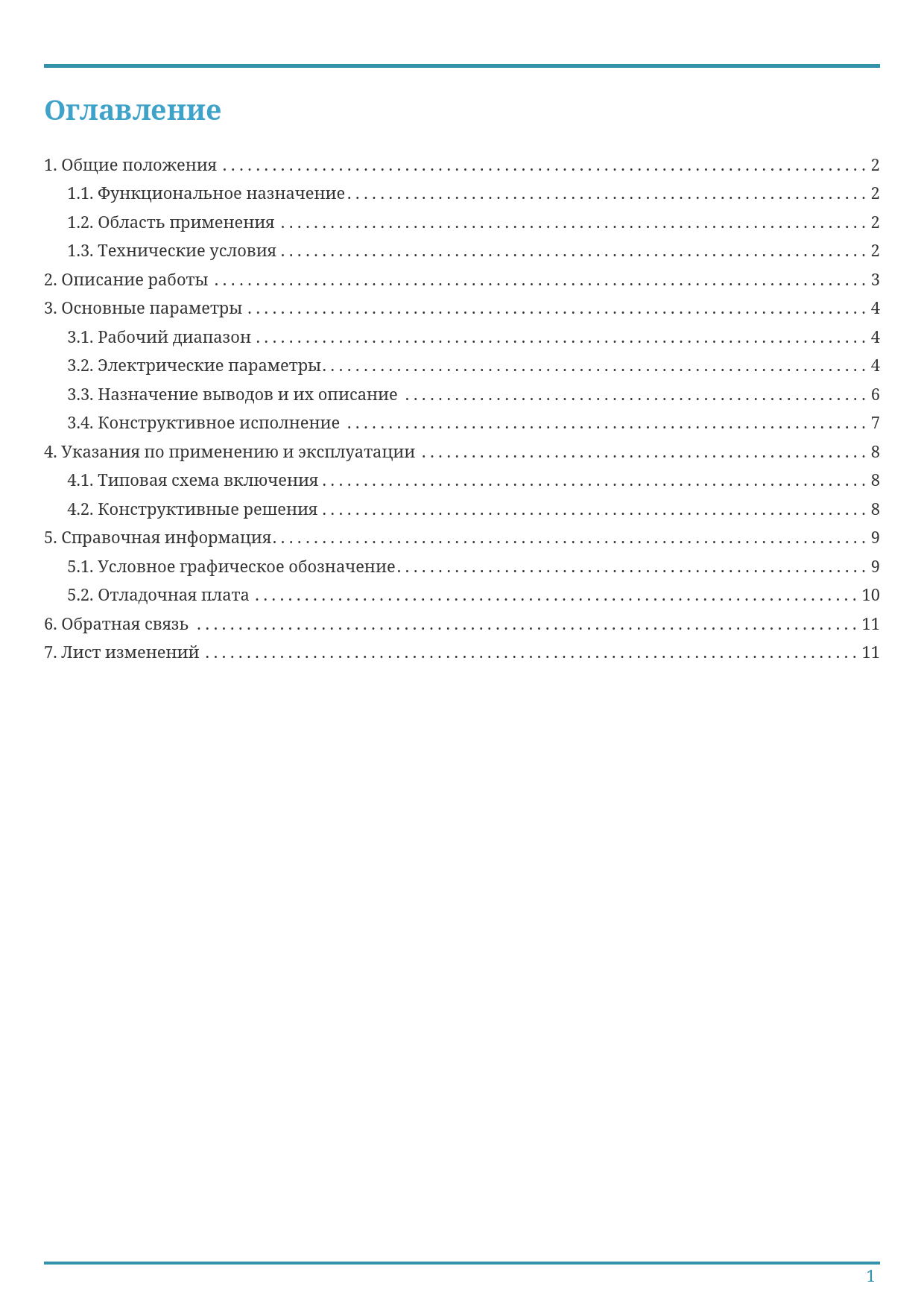 1. Общие положения . 2  1.1. Функциональное назначение. 2  1.2. Область применения . 2  1.3. Технические условия . 2  2. Описание работы . 3  3. Основные параметры . 4  3.1. Рабочий диапазон . 4  3.2. Электрические параметры. 4  3.3. Назначение выводов и их описание . 6  3.4. Конструктивное исполнение . 7  4. Указания по применению и эксплуатации . 8  4.1. Типовая схема включения . 8  4.2. Конструктивные решения . 8  5. Справочная информация. 9  5.1. Условное графическое обозначение. 9  5.2. Отладочная плата . 10   6. Обратная связь . 11   7. Лист изменений . 11   1 Document Outline Микросборка двухканальная гальванической развязки цифровых сигналов 2015ВВ045 : 1.0 Оглавление 1. Общие положения 1.1. Функциональное назначение 1.2. Область применения 1.3. Технические условия 2. Описание работы 3. Основные параметры 3.1. Рабочий диапазон 3.2. Электрические параметры 3.3. Назначение выводов и их описание 3.4. Конструктивное исполнение 4. Указания по применению и эксплуатации 4.1. Типовая схема включения 4.2. Конструктивные решения 5. Справочная информация 5.1. Условное графическое обозначение 5.2. Отладочная плата 6. Обратная связь 7. Лист изменений
