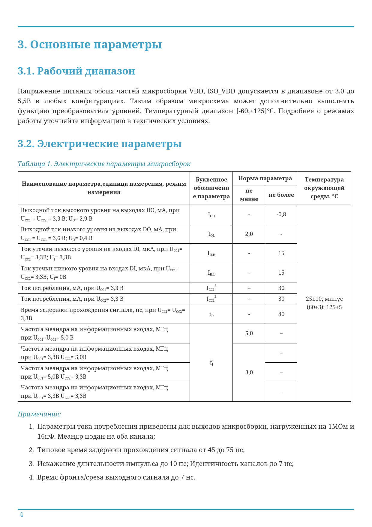 3 Основные параметры 3.1 Рабочий диапазон 3.2 Электрические параметры Буквенное Норма параметра Температура