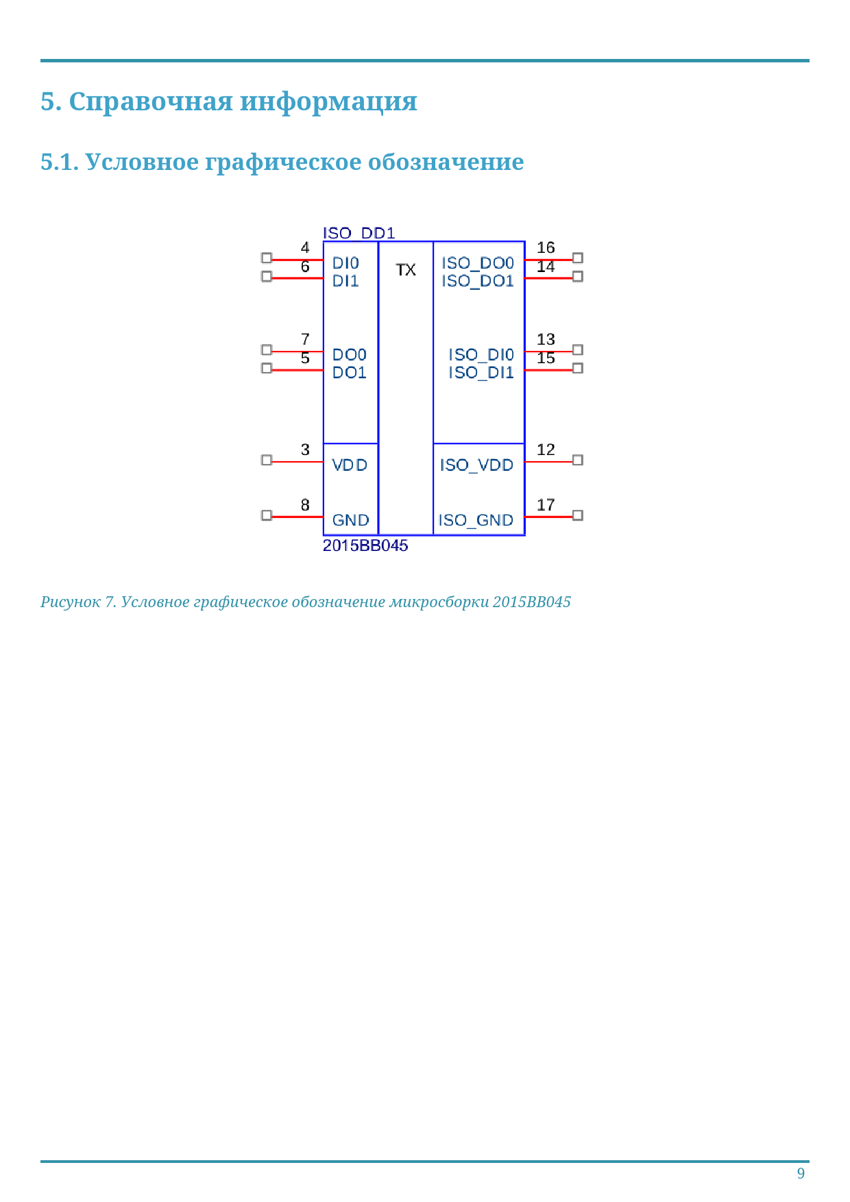 Рисунок 7. Условное графическое обозначение микросборки 2015ВВ045 9 Document Outline Микросборка двухканальная гальванической развязки цифровых сигналов 2015ВВ045 : 1.0 Оглавление 1. Общие положения 1.1. Функциональное назначение 1.2. Область применения 1.3. Технические условия 2. Описание работы 3. Основные параметры 3.1. Рабочий диапазон 3.2. Электрические параметры 3.3. Назначение выводов и их описание 3.4. Конструктивное исполнение 4. Указания по применению и эксплуатации 4.1. Типовая схема включения 4.2. Конструктивные решения 5. Справочная информация 5.1. Условное графическое обозначение 5.2. Отладочная плата 6. Обратная связь 7. Лист изменений