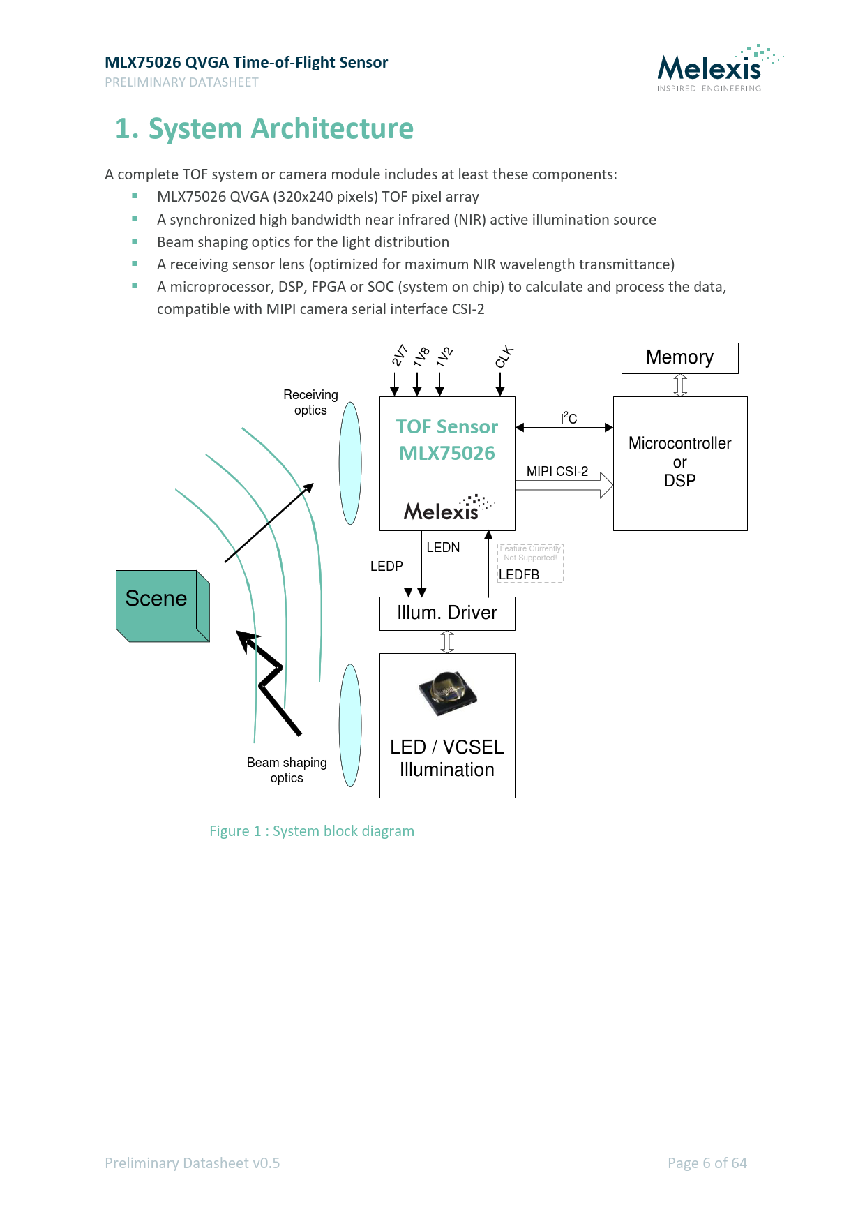 | Pages / Page | 64 / 6 — MLX75026 QVGA Time-of-Flight Sensor. 1. System Architecture. TOF Sensor. … |