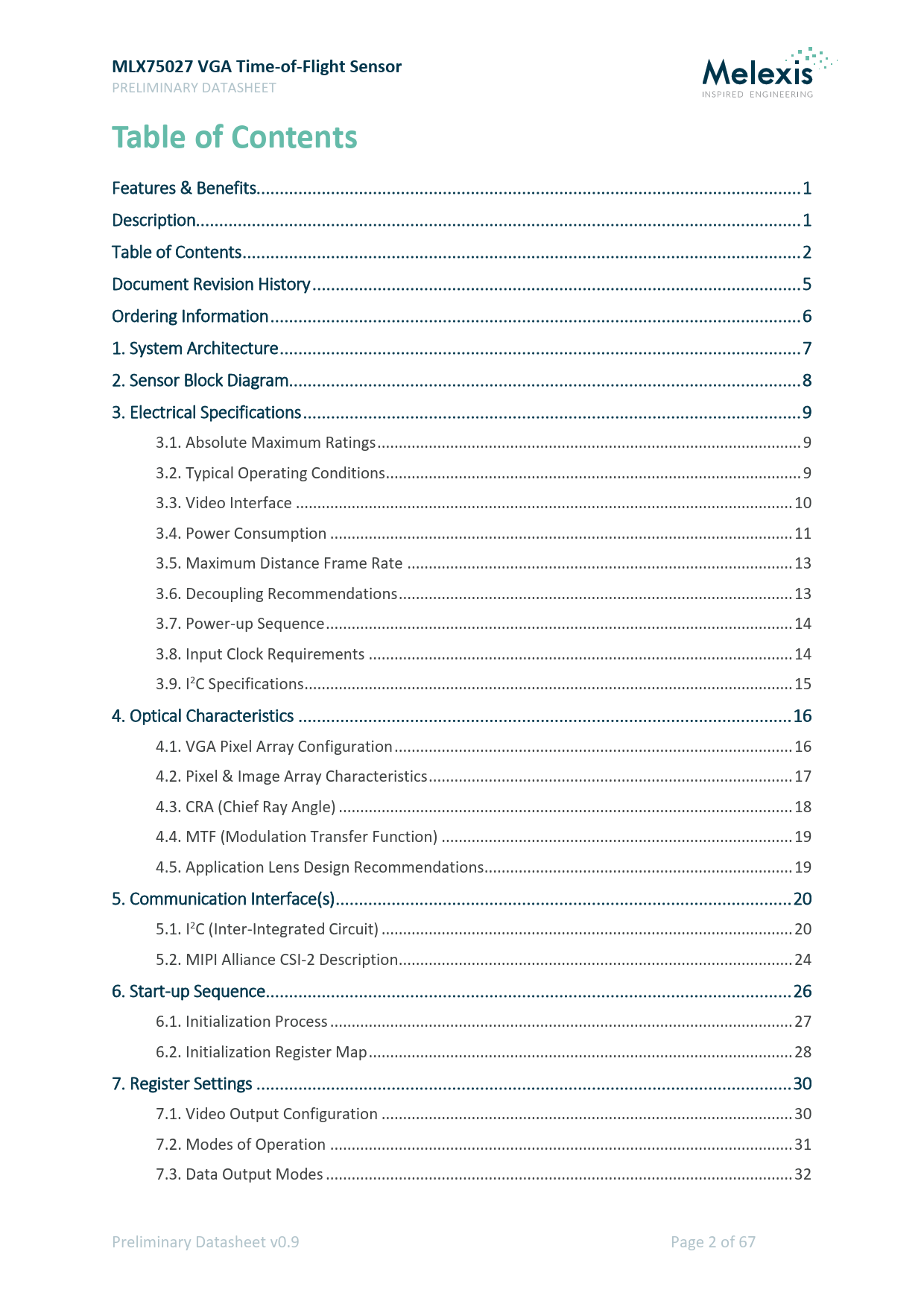 link to page 1 link to page 1 link to page 2 link to page 5 link to page 6 link to page 7 link to page 8 link to page 9 link to page 9 link to page 9 link to page 10 link to page 11 link to page 13 link to page 13 link to page 14 link to page 14 link to page 15 link to page 16 link to page 16 link to page 17 link to page 18 link to page 19 link to page 19 link to page 20 link to page 20 link to page 24 link to page 26 link to page 27 link to page 28 link to page 30 link to page 30 link to page 31 link to page 32 MLX75027 VGA Time-of-Flight Sensor PRELIMINARY DATASHEET Table of Contents Features & Benefits... 1 Description.. 1 Table of Contents .. 2 Document Revision History ... 5 Ordering Information .. 6 1. System Architecture .. 7 2. Sensor Block Diagram .. 8 3. Electrical Specifications ... 9 3.1. Absolute Maximum Ratings ... 9 3.2. Typical Operating Conditions ... 9 3.3. Video Interface .. 10 3.4. Power Consumption .. 11 3.5. Maximum Distance Frame Rate .. 13 3.6. Decoupling Recommendations .. 13 3.7. Power-up Sequence ... 14 3.8. Input Clock Requirements ... 14 3.9. I2C Specifications .. 15 4. Optical Characteristics .. 16 4.1. VGA Pixel Array Configuration ... 16 4.2. Pixel & Image Array Characteristics ... 17 4.3. CRA (Chief Ray Angle) .. 18 4.4. MTF (Modulation Transfer Function) .. 19 4.5. Application Lens Design Recommendations .. 19 5. Communication Interface(s) .. 20 5.1. I2C (Inter-Integrated Circuit) .. 20 5.2. MIPI Alliance CSI-2 Description .. 24 6. Start-up Sequence ... 26 6.1. Initialization Process .. 27 6.2. Initialization Register Map ... 28 7. Register Settings ... 30 7.1. Video Output Configuration .. 30 7.2. Modes of Operation .. 31 7.3. Data Output Modes ... 32 Preliminary Datasheet v0.9 Page 2 of 67 Document Outline Table of Contents Document Revision History Ordering Information 1. System Architecture 2. Sensor Block Diagram 3. Electrical Specifications 3.1. Absolute Maximum Ratings 3.2. Typical Operating Conditions 3.3. Video Interface 3.3.1. MIPI DC specification 3.3.2. MIPI AC specification 3.4. Power Consumption 3.5. Maximum Distance Frame Rate 3.6. Decoupling Recommendations 3.7. Power-up Sequence 3.8. Input Clock Requirements 3.9. I2C Specifications 4. Optical Characteristics 4.1. VGA Pixel Array Configuration 4.2. Pixel & Image Array Characteristics 4.3. CRA (Chief Ray Angle) 4.4. MTF (Modulation Transfer Function ) 4.5. Application Lens Design Recommendations 5. Communication Interface(s) 5.1. I2C (Inter-Integrated Circuit) 5.1.1. I2C Timing Sequence 5.1.2. Single I2C Read 5.1.3. Sequential I2C Read 5.1.4. Single I2C Write 5.1.5. Sequential I2C Write 5.1.6. I2C Slave Address 5.2. MIPI Alliance CSI-2 Description 5.2.1. Packet Structure 5.2.2. Data Format RAW12 5.2.2.1. Data Format in 4 Lane MIPI Configuration 5.2.2.2. Data Format in 2 Lane MIPI Configuration 6. Start-up Sequence 6.1. Initialization Process 6.2. Initialization Register Map 7. Register Settings 7.1. Video Output Configuration 7.2. Modes of Operation 7.3. Data Output Modes 7.4. HMAX & Frame Read-Out Time 7.4.1. PLLSSETUP 7.4.2. PRETIME 7.4.3. RANDNM0 7.5. PARAM_HOLD 7.6. USER_ID Register 7.7. Modulation Frequency 7.8. Frame Structure & Frame Rate 7.9. FRAME_STARTUP 7.10. FRAME_TIME 7.11. PHASE_COUNT 7.12. Px_PREHEAT, Px_PREMIX 7.13. Px_INTEGRATION 7.14. Px_PHASE_SHIFT 7.15. Px_PHASE_IDLE (or V-blanking) 7.16. Px_LEDEN 7.17. Px_DMIX0, Px_DMIX1 & Px_STATIC_LED 7.18. Analog Delay Setting 7.18.1. Coarse Delay 7.18.2. Fine Delay 7.18.3. Super Fine 7.19. Pixel Binning 7.20. Region of Interest (ROI) 7.21. Flip & Mirror 7.22. Temperature Sensor 7.23. Pixel & Phase Statistics 7.24. PN9 Test Pattern 7.25. Duty Cycle Adjustment 7.26. Illumination Signal (subLVDS or CMOS) 8. MetaData Description 8.1. Embedded Data Format in 4 Lane MIPI Configuration 8.2. Embedded Data Format in 2 Lane MIPI Configuration 9. Distance & Amplitude Calculation 10. Package Information 10.1. Transmittance and Reflectance 10.2. Pinout & Equivalent I/O Circuitry 10.3. Mechanical Dimensions 10.4. Package Marking 10.5. PCB Landing Pattern 10.6. Reflow Solder Profile 10.7. Reflow Cleaning Instructions 10.8. Cover Tape Removal Disclaimer
