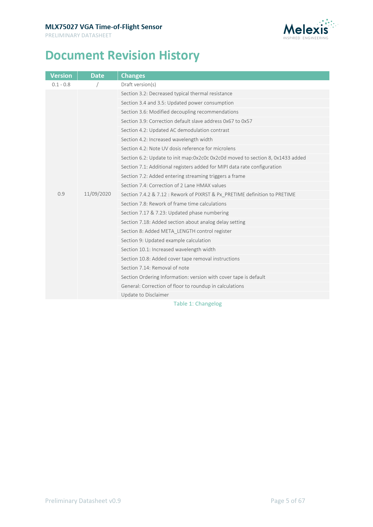 link to page 9 link to page 11 link to page 13 link to page 13 link to page 15 link to page 17 link to page 17 link to page 17 link to page 28 link to page 30 link to page 31 link to page 33 link to page 34 link to page 39 link to page 37 link to page 44 link to page 50 link to page 45 link to page 55 link to page 58 link to page 59 link to page 66 link to page 42 MLX75027 VGA Time-of-Flight Sensor PRELIMINARY DATASHEET Document Revision HistoryVersionDateChanges 0.1 - 0.8 / Draft version(s) Section 3.2: Decreased typical thermal resistance Section 3.4 and 3.5: Updated power consumption Section 3.6: Modified decoupling recommendations Section 3.9: Correction default slave address 0x67 to 0x57 Section 4.2: Updated AC demodulation contrast Section 4.2: Increased wavelength width Section 4.2: Note UV dosis reference for microlens Section 6.2: Update to init map:0x2c0c 0x2c0d moved to section 8, 0x1433 added Section 7.1: Additional registers added for MIPI data rate configuration Section 7.2: Added entering streaming triggers a frame Section 7.4: Correction of 2 Lane HMAX values 0.9 11/09/2020 Section 7.4.2 & 7.12 : Rework of PIXRST & Px_PRETIME definition to PRETIME Section 7.8: Rework of frame time calculations Section 7.17 & 7.23: Updated phase numbering Section 7.18: Added section about analog delay setting Section 8: Added META_LENGTH control register Section 9: Updated example calculation Section 10.1: Increased wavelength width Section 10.8: Added cover tape removal instructions Section 7.14: Removal of note Section Ordering Information: version with cover tape is default General: Correction of floor to roundup in calculations Update to Disclaimer Table 1: Changelog Preliminary Datasheet v0.9 Page 5 of 67 Document Outline Table of Contents Document Revision History Ordering Information 1. System Architecture 2. Sensor Block Diagram 3. Electrical Specifications 3.1. Absolute Maximum Ratings 3.2. Typical Operating Conditions 3.3. Video Interface 3.3.1. MIPI DC specification 3.3.2. MIPI AC specification 3.4. Power Consumption 3.5. Maximum Distance Frame Rate 3.6. Decoupling Recommendations 3.7. Power-up Sequence 3.8. Input Clock Requirements 3.9. I2C Specifications 4. Optical Characteristics 4.1. VGA Pixel Array Configuration 4.2. Pixel & Image Array Characteristics 4.3. CRA (Chief Ray Angle) 4.4. MTF (Modulation Transfer Function ) 4.5. Application Lens Design Recommendations 5. Communication Interface(s) 5.1. I2C (Inter-Integrated Circuit) 5.1.1. I2C Timing Sequence 5.1.2. Single I2C Read 5.1.3. Sequential I2C Read 5.1.4. Single I2C Write 5.1.5. Sequential I2C Write 5.1.6. I2C Slave Address 5.2. MIPI Alliance CSI-2 Description 5.2.1. Packet Structure 5.2.2. Data Format RAW12 5.2.2.1. Data Format in 4 Lane MIPI Configuration 5.2.2.2. Data Format in 2 Lane MIPI Configuration 6. Start-up Sequence 6.1. Initialization Process 6.2. Initialization Register Map 7. Register Settings 7.1. Video Output Configuration 7.2. Modes of Operation 7.3. Data Output Modes 7.4. HMAX & Frame Read-Out Time 7.4.1. PLLSSETUP 7.4.2. PRETIME 7.4.3. RANDNM0 7.5. PARAM_HOLD 7.6. USER_ID Register 7.7. Modulation Frequency 7.8. Frame Structure & Frame Rate 7.9. FRAME_STARTUP 7.10. FRAME_TIME 7.11. PHASE_COUNT 7.12. Px_PREHEAT, Px_PREMIX 7.13. Px_INTEGRATION 7.14. Px_PHASE_SHIFT 7.15. Px_PHASE_IDLE (or V-blanking) 7.16. Px_LEDEN 7.17. Px_DMIX0, Px_DMIX1 & Px_STATIC_LED 7.18. Analog Delay Setting 7.18.1. Coarse Delay 7.18.2. Fine Delay 7.18.3. Super Fine 7.19. Pixel Binning 7.20. Region of Interest (ROI) 7.21. Flip & Mirror 7.22. Temperature Sensor 7.23. Pixel & Phase Statistics 7.24. PN9 Test Pattern 7.25. Duty Cycle Adjustment 7.26. Illumination Signal (subLVDS or CMOS) 8. MetaData Description 8.1. Embedded Data Format in 4 Lane MIPI Configuration 8.2. Embedded Data Format in 2 Lane MIPI Configuration 9. Distance & Amplitude Calculation 10. Package Information 10.1. Transmittance and Reflectance 10.2. Pinout & Equivalent I/O Circuitry 10.3. Mechanical Dimensions 10.4. Package Marking 10.5. PCB Landing Pattern 10.6. Reflow Solder Profile 10.7. Reflow Cleaning Instructions 10.8. Cover Tape Removal Disclaimer