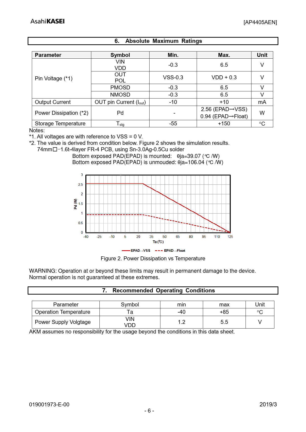 [AP4405AEN] 6. Absolute Maximum RatingsParameterSymbolMin.Max.Unit VIN -0.3 VDD 6.5 V OUT Pin Voltage (*1) VSS-0.3 POL VDD + 0.3 V PMOSD -0.3 6.5 V NMOSD -0.3 6.5 V Output Current OUT pin Current (Iout) -10 +10 mA 2.56 (EPAD→VSS) Power Dissipation (*2) Pd - W 0.94 (EPAD →Float) Storage Temperature Tstg -55 +150 C Notes: *1. All voltages are with reference to VSS = 0 V. *2. The value is derived from condition below. Figure 2 shows the simulation results. 74mm□-1.6t-4layer FR-4 PCB, using Sn-3.0Ag-0.5Cu solder Bottom exposed PAD(EPAD) is mounted: θja=39.07 (°C /W) Bottom exposed PAD(EPAD) is unmouded: θja=106.04 (°C /W) Figure 2. Power Dissipation vs Temperature WARNING: Operation at or beyond these limits may result in permanent damage to the device. Normal operation is not guaranteed at these extremes. 7. Recommended Operating Conditions Parameter Symbol min max Unit Operation Temperature Ta -40 +85 C Power Supply Volgtage VIN 1.2 VDD 5.5 V AKM assumes no responsibility for the usage beyond the conditions in this data sheet. 019001973-E-00 2019/3 - 6 -