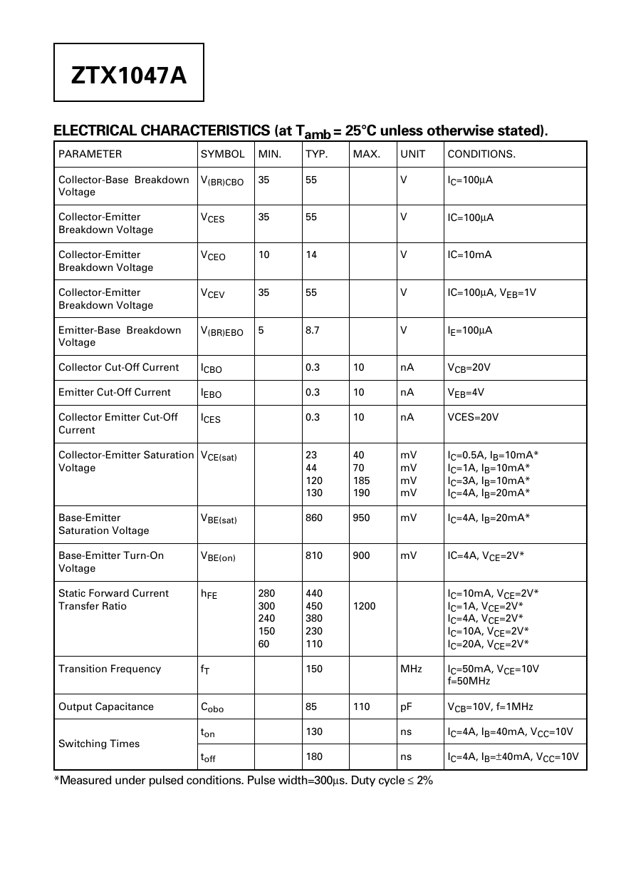 | Pages / Page | 4 / 2 — ZTX1047A. ZTX1047A. ELECTRICAL. CHARACTERISTICS. (at. Tamb. =. 25°C. … |