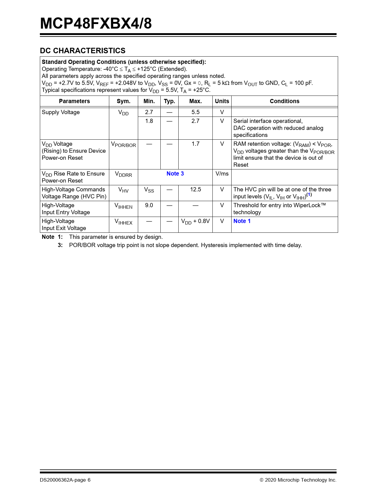 MCP48FXBX4/8. DC CHARACTERISTICS. Standard Operating Conditions (unless otherwise specified):. Parameters. Sym. Min. Typ. Max. Units