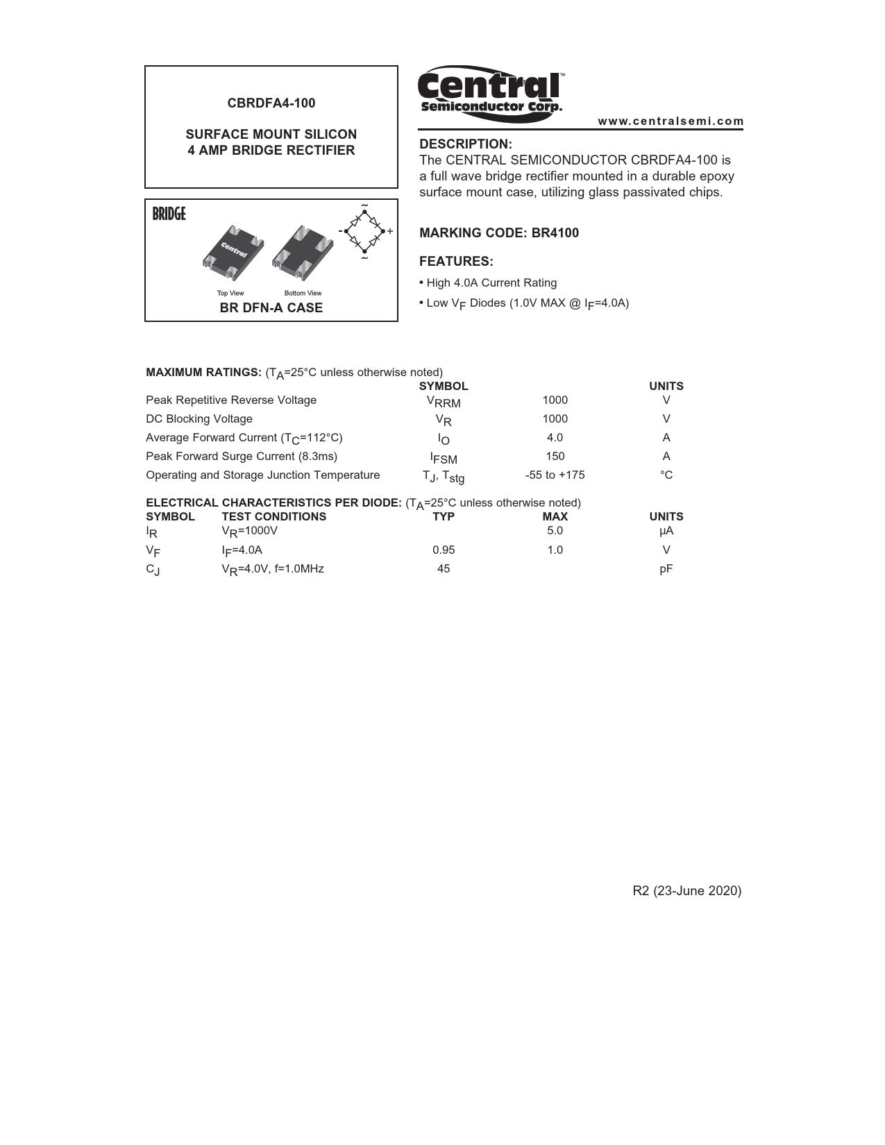 CBRDFA4-100 w w w. c e n t r a l s e m i . c o m SURFACE MOUNT SILICON DESCRIPTION: 4 AMP BRIDGE RECTIFIER