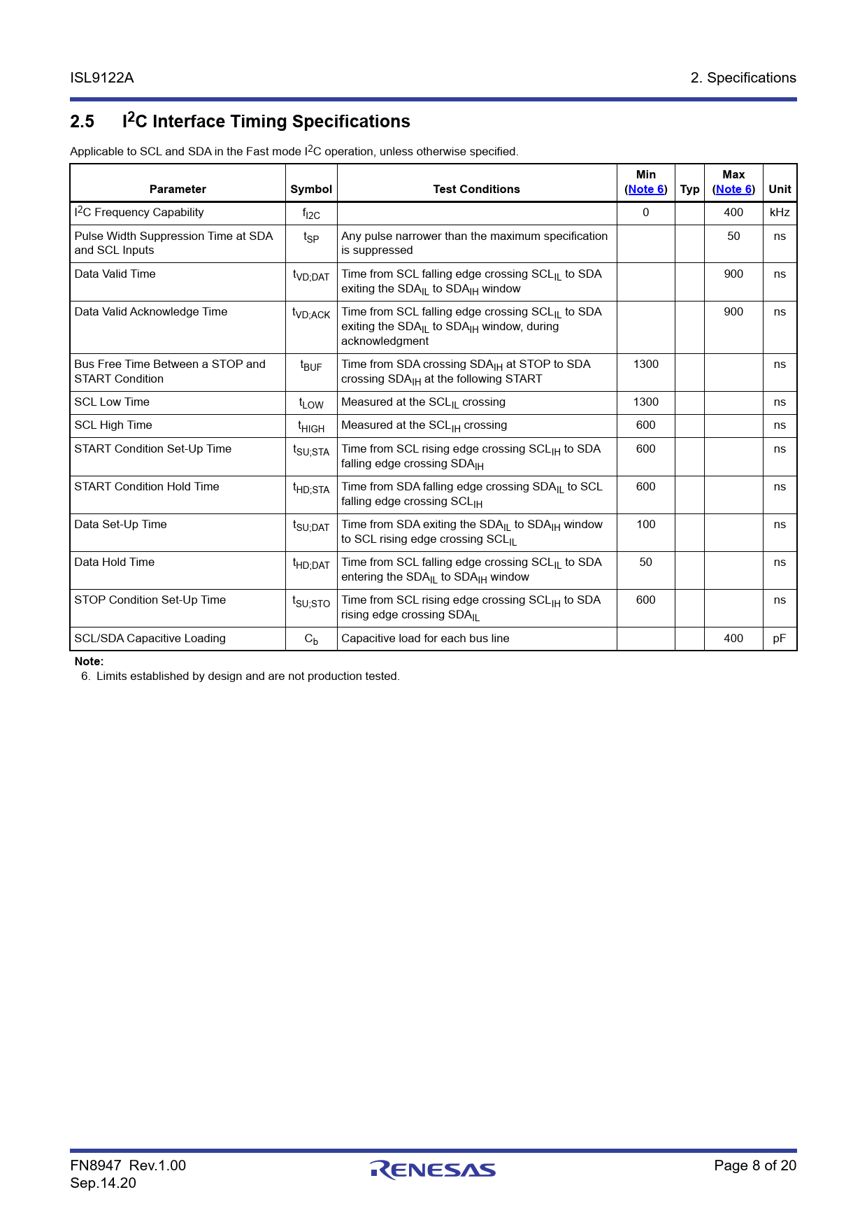 link to page 8 link to page 8 ISL9122A 2. Specifications 2.5I2C Interface Timing Specifications Applicable to SCL and SDA in the Fast mode I2C operation, unless otherwise specified. MinMaxParameterSymbolTest Conditions(Note 6)Typ (Note 6)Unit I2C Frequency Capability fI2C 0 400 kHz Pulse Width Suppression Time at SDA tSP Any pulse narrower than the maximum specification 50 ns and SCL Inputs is suppressed Data Valid Time tVD;DAT Time from SCL falling edge crossing SCLIL to SDA 900 ns exiting the SDAIL to SDAIH window Data Valid Acknowledge Time tVD;ACK Time from SCL falling edge crossing SCLIL to SDA 900 ns exiting the SDAIL to SDAIH window, during acknowledgment Bus Free Time Between a STOP and tBUF Time from SDA crossing SDAIH at STOP to SDA 1300 ns START Condition crossing SDAIH at the following START SCL Low Time tLOW Measured at the SCLIL crossing 1300 ns SCL High Time tHIGH Measured at the SCLIH crossing 600 ns START Condition Set-Up Time tSU;STA Time from SCL rising edge crossing SCLIH to SDA 600 ns falling edge crossing SDAIH START Condition Hold Time tHD;STA Time from SDA falling edge crossing SDAIL to SCL 600 ns falling edge crossing SCLIH Data Set-Up Time tSU;DAT Time from SDA exiting the SDAIL to SDAIH window 100 ns to SCL rising edge crossing SCLIL Data Hold Time tHD;DAT Time from SCL falling edge crossing SCLIL to SDA 50 ns entering the SDAIL to SDAIH window STOP Condition Set-Up Time tSU;STO Time from SCL rising edge crossing SCLIH to SDA 600 ns rising edge crossing SDAIL SCL/SDA Capacitive Loading Cb Capacitive load for each bus line 400 pF Note: 6. Limits established by design and are not production tested. FN8947 Rev.1.00 Page 8 of 20 Sep.14.20 Document Outline Features Applications Related Literature Contents 1. Overview 1.1 Block Diagram 1.2 Ordering Information 1.3 Pin Configurations 1.4 Pin Descriptions 2. Specifications 2.1 Absolute Maximum Ratings 2.2 Thermal Information 2.3 Recommended Operation Conditions 2.4 Analog Specifications 2.5 I2C Interface Timing Specifications 3. Typical Performance Curves 4. Functional Description 4.1 Enable Input 4.2 Soft Discharge 4.3 Start-Up 4.4 Overcurrent/Short-Circuit Protection 4.5 Thermal Shutdown 4.6 Buck-Boost Conversion Topology 4.7 PWM Operation 4.8 PFM Operation 4.9 Operation With VIN Close to VOUT 4.10 Forced Operating Modes 4.11 I2C Serial Interface 4.12 Protocol Conventions 4.13 Write Operation 4.14 Read Operation 4.15 Register Descriptions 4.15.1 RO_REG1 4.15.2 INTFLG_REG 4.15.3 VSET 4.15.4 CONV_CFG 4.15.5 INTFLG_MASK 5. Revision History 6. Package Outline Drawings