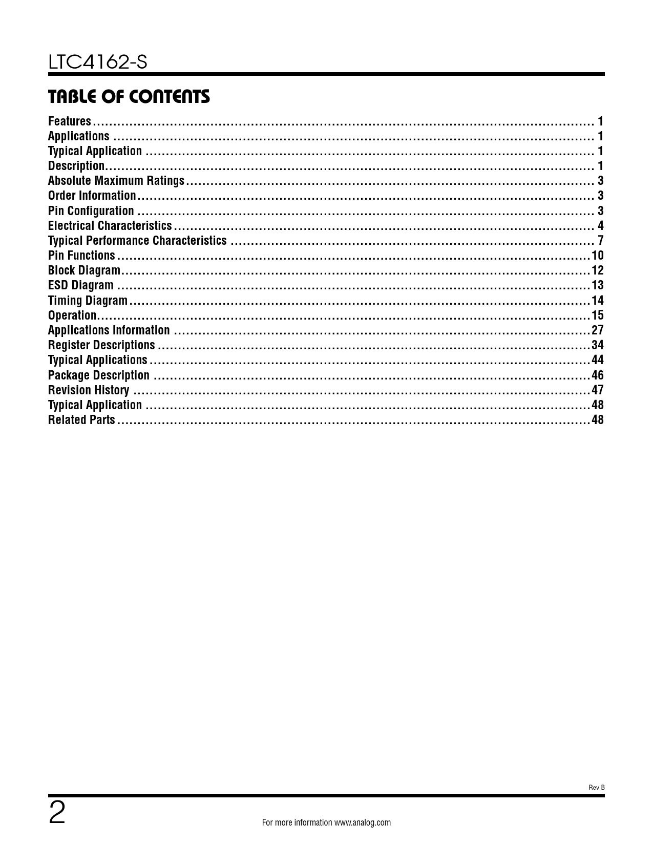link to page 1 link to page 1 link to page 1 link to page 1 link to page 3 link to page 3 link to page 3 link to page 4 link to page 7 link to page 10 link to page 12 link to page 13 link to page 14 link to page 15 link to page 27 link to page 34 link to page 44 link to page 46 link to page 47 link to page 48 link to page 48 LTC4162-S TABLE OF CONTENTS Features .. 1Applications ... 1Typical Application ... 1Description... 1Absolute Maximum Ratings ... 3Order Information ... 3Pin Configuration ... 3Electrical Characteristics .. 4Typical Performance Characteristics .. 7Pin Functions ...10Block Diagram ..12ESD Diagram ...13Timing Diagram ..14Operation..15Applications Information ...27Register Descriptions ...34Typical Applications ...44Package Description ..46Revision History ...47Typical Application ..48Related Parts ...48 Rev B 2 For more information www.analog.com Document Outline Features Applications Typical Application Description Absolute Maximum Ratings Order Information Pin Configuration Electrical Characteristics Typical Performance Characteristics Pin Functions Block Diagram ESD Diagram Timing Diagram Operation Applications Information Register Descriptions Typical Applications Package Description Revision History Typical Application Related Parts