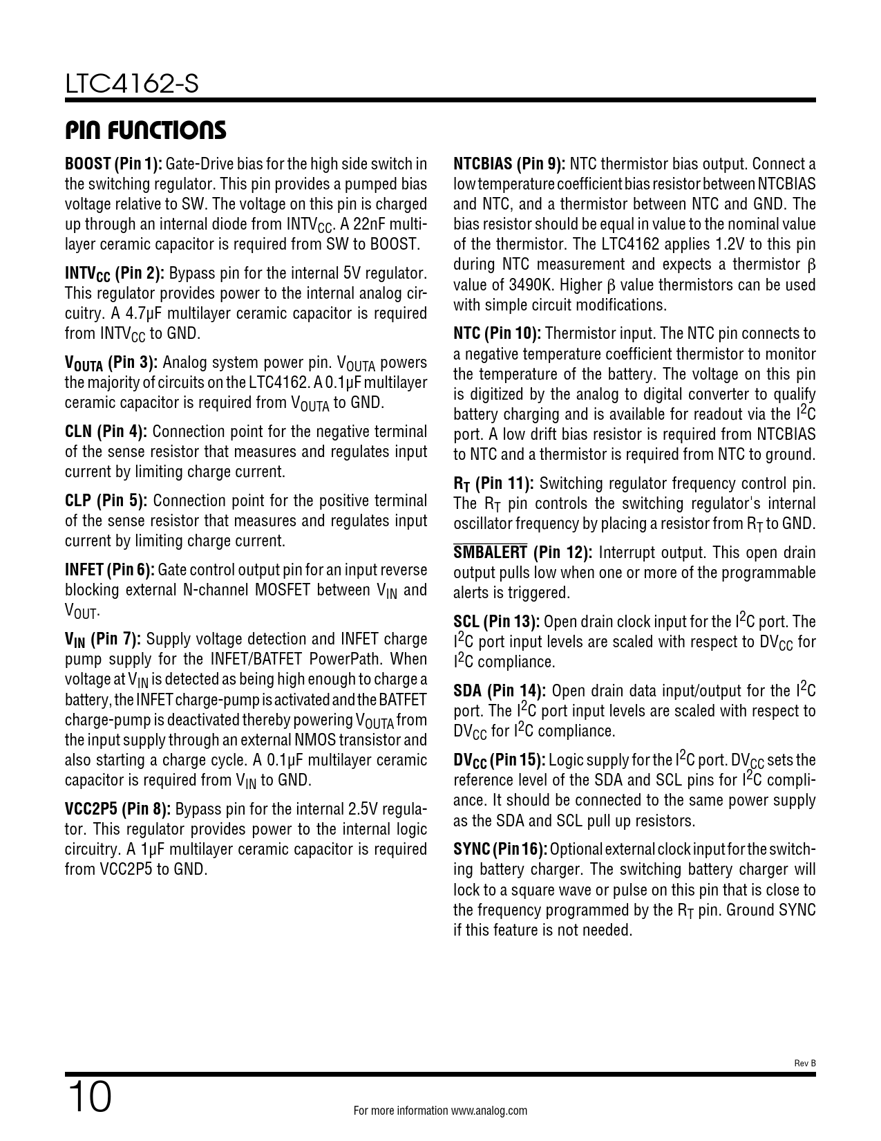 LTC4162-S PIN FUNCTIONS BOOST (Pin 1): Gate-Drive bias for the high side switch in NTCBIAS (Pin 9): NTC thermistor bias output. Connect a the switching regulator. This pin provides a pumped bias low temperature coefficient bias resistor between NTCBIAS voltage relative to SW. The voltage on this pin is charged and NTC, and a thermistor between NTC and GND. The up through an internal diode from INTVCC. A 22nF multi- bias resistor should be equal in value to the nominal value layer ceramic capacitor is required from SW to BOOST. of the thermistor. The LTC4162 applies 1.2V to this pin INTV during NTC measurement and expects a thermistor β CC (Pin 2): Bypass pin for the internal 5V regulator. This regulator provides power to the internal analog cir- value of 3490K. Higher β value thermistors can be used cuitry. A 4.7µF multilayer ceramic capacitor is required with simple circuit modifications. from INTVCC to GND. NTC (Pin 10): Thermistor input. The NTC pin connects to V a negative temperature coefficient thermistor to monitor OUTA (Pin 3): Analog system power pin. VOUTA powers the majority of circuits on the LTC4162. A 0.1µF multilayer the temperature of the battery. The voltage on this pin ceramic capacitor is required from V is digitized by the analog to digital converter to qualify OUTA to GND. battery charging and is available for readout via the I2C CLN (Pin 4): Connection point for the negative terminal port. A low drift bias resistor is required from NTCBIAS of the sense resistor that measures and regulates input to NTC and a thermistor is required from NTC to ground. current by limiting charge current. RT (Pin 11): Switching regulator frequency control pin. CLP (Pin 5): Connection point for the positive terminal The RT pin controls the switching regulator's internal of the sense resistor that measures and regulates input oscillator frequency by placing a resistor from RT to GND. current by limiting charge current. SMBALERT (Pin 12): Interrupt output. This open drain INFET (Pin 6): Gate control output pin for an input reverse output pulls low when one or more of the programmable blocking external N-channel MOSFET between VIN and alerts is triggered. VOUT. SCL (Pin 13): Open drain clock input for the I2C port. The VIN (Pin 7): Supply voltage detection and INFET charge I2C port input levels are scaled with respect to DVCC for pump supply for the INFET/BATFET PowerPath. When I2C compliance. voltage at VIN is detected as being high enough to charge a battery, the INFET charge-pump is activated and the BATFET SDA (Pin 14): Open drain data input/output for the I2C charge-pump is deactivated thereby powering V port. The I2C port input levels are scaled with respect to OUTA from the input supply through an external NMOS transistor and DVCC for I2C compliance. also starting a charge cycle. A 0.1µF multilayer ceramic DVCC (Pin 15): Logic supply for the I2C port. DVCC sets the capacitor is required from VIN to GND. reference level of the SDA and SCL pins for I2C compli- VCC2P5 (Pin 8): Bypass pin for the internal 2.5V regula- ance. It should be connected to the same power supply tor. This regulator provides power to the internal logic as the SDA and SCL pull up resistors. circuitry. A 1µF multilayer ceramic capacitor is required SYNC (Pin 16): Optional external clock input for the switch- from VCC2P5 to GND. ing battery charger. The switching battery charger will lock to a square wave or pulse on this pin that is close to the frequency programmed by the RT pin. Ground SYNC if this feature is not needed. Rev B 10 For more information www.analog.com Document Outline Features Applications Typical Application Description Absolute Maximum Ratings Order Information Pin Configuration Electrical Characteristics Typical Performance Characteristics Pin Functions Block Diagram ESD Diagram Timing Diagram Operation Applications Information Register Descriptions Typical Applications Package Description Revision History Typical Application Related Parts