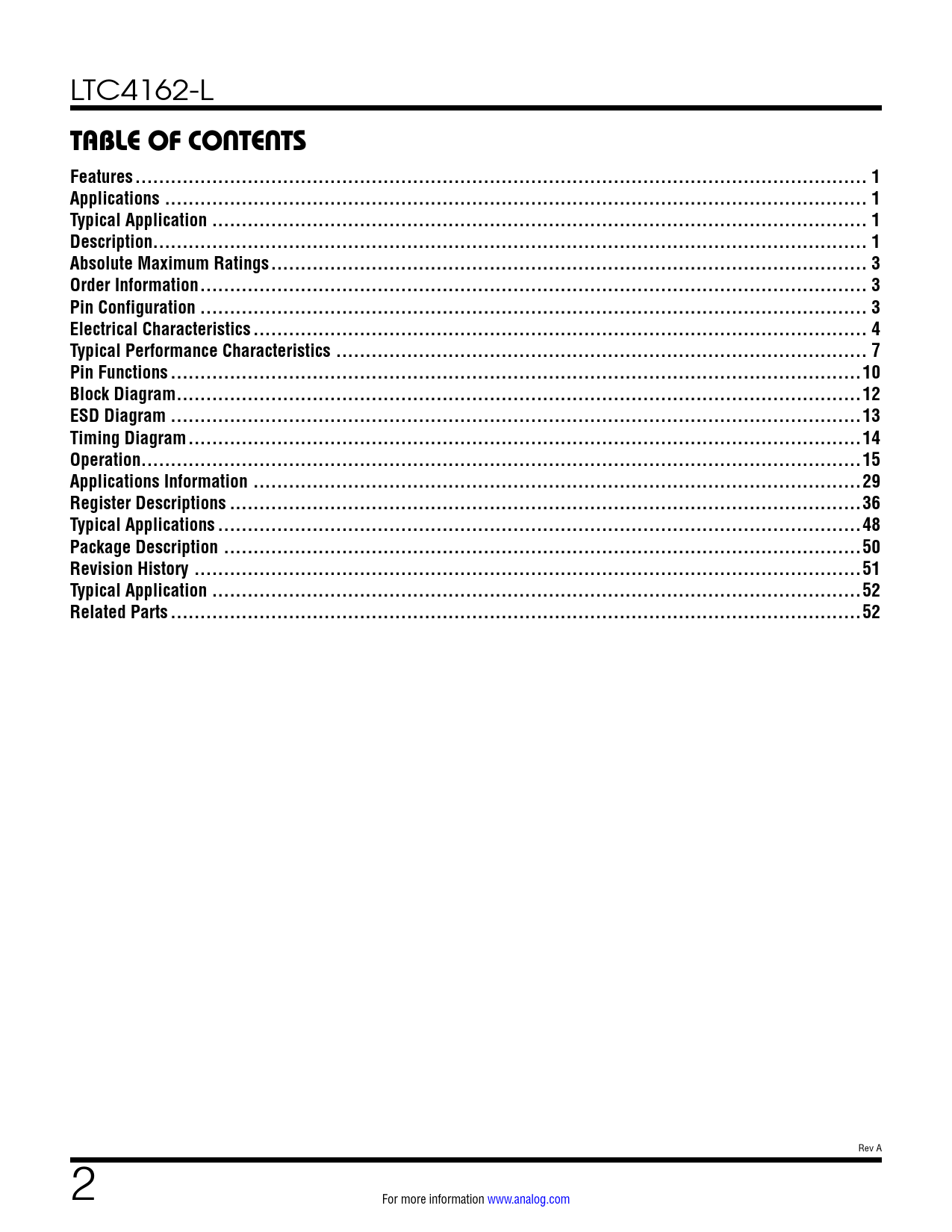 link to page 1 link to page 1 link to page 1 link to page 1 link to page 3 link to page 3 link to page 3 link to page 4 link to page 7 link to page 10 link to page 12 link to page 13 link to page 14 link to page 15 link to page 29 link to page 36 link to page 48 link to page 50 link to page 51 link to page 52 link to page 52 LTC4162-L TABLE OF CONTENTS Features .. 1Applications ... 1Typical Application ... 1Description... 1Absolute Maximum Ratings ... 3Order Information ... 3Pin Configuration ... 3Electrical Characteristics .. 4Typical Performance Characteristics .. 7Pin Functions ...10Block Diagram ..12ESD Diagram ...13Timing Diagram ..14Operation..15Applications Information ...29Register Descriptions ...36Typical Applications ...48Package Description ..50Revision History ...51Typical Application ..52Related Parts ...52 Rev A 2 For more information www.analog.com Document Outline Features Applications Typical Application Description Absolute Maximum Ratings Order Information Pin Configuration Electrical Characteristics Typical Performance Characteristics Pin Functions Block Diagram ESD Diagram Timing Diagram Operation Applications Information Register Descriptions Typical Applications Package Description Revision History Typical Application Related Parts