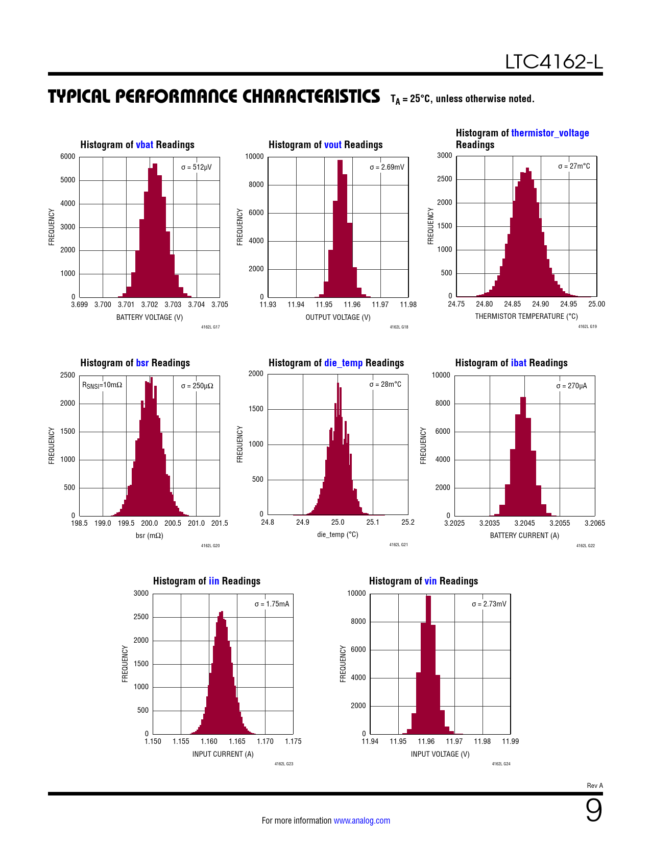 2500 2000 10000 S R NSI =10mΩ σ = 250µΩ σ = 28m°C σ = 270µA 2000 8000 1500 1500 6000 1000 1000 FREQUENCY FREQUENCY 4000 FREQUENCY 500 500 2000 0 0 0 198.5 199.0 199.5 200.0 200.5 201.0 201.5 24.8 24.9 25.0 25.1 25.2 3.2025 3.2035 3.2045 3.2055 3.2065 bsr (mΩ) die_temp (°C) BATTERY CURRENT (A) 4162L G20 4162L G21 4162L G22