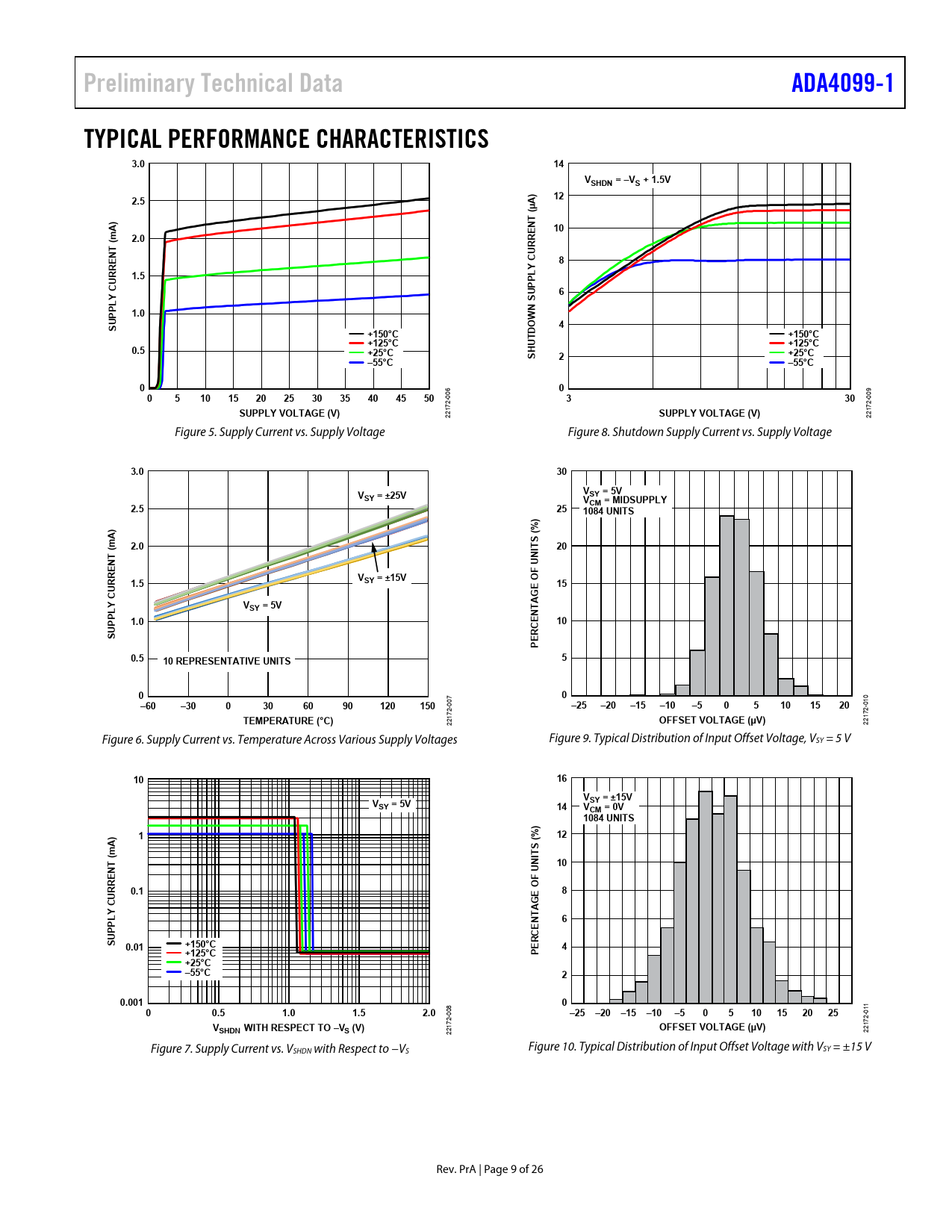 Preliminary Technical DataADA4099-1TYPICAL PERFORMANCE CHARACTERISTICS3.014VSHDN = –VS + 1.5V)122.5A (µA)NT10E2.0(m TRRN ECU8Y1.5LURRP PCUY6LSPN1.0WUP SO4+150°CD+150°C+125°C+125°C0.5+25°CHUT S2+25°C–55°C–55°C0005101520253035404550 006 330 009 72- 72- SUPPLY VOLTAGE (V) 221 SUPPLY VOLTAGE (V) 221 Figure 5. Supply Current vs. Supply Voltage Figure 8. Shutdown Supply Current vs. Supply Voltage 3.030VVSY = ±25VSY = 5VVCM = MIDSUPPLY2.5251084 UNITS) (%A)S2.0(mIT20TNN EU FVO1.5SY = ±15V15URRECGYVALSY = 5VTP1.0EN10UPCSR PE0.510 REPRESENTATIVE UNITS500 0 –60–300306090120150 007 –25–20–15–10–505101520 01 2- 72- TEMPERATURE (°C)OFFSET VOLTAGE (µV) 221 2217 Figure 6. Supply Current vs. Temperature Across Various Supply Voltages Figure 9. Typical Distribution of Input Offset Voltage, VSY = 5 V 1016VVSY = ±15VSY = 5V14VCM = 0V1084 UNITS)112(% S(mA)IT N10NTU F0.1O8ECURREGYALT6PENUPCSR0.01+150°C4+125°CPE+25°C–55°C20.0010 8 00.51.01.52.0 011 -00 –25 –20 –15 –10–50510152025 72- V 172 SHDN WITH RESPECT TO –VS (V)OFFSET VOLTAGE (µV) 22 221 Figure 7. Supply Current vs. V Figure 10. Typical Distribution of Input Offset Voltage with V SHDN with Respect to −VS SY = ±15 V Rev. PrA | Page 9 of 26 Document Outline FEATURES APPLICATIONS GENERAL DESCRIPTION TYPICAL APPLICATION CIRCUIT TABLE OF CONTENTS SPECIFICATIONS 5 V SUPPLY ±15 V SUPPLY ABSOLUTE MAXIMUM RATINGS MAXIMUM POWER DISSIPATION THERMAL RESISTANCE ESD CAUTION PIN CONFIGURATION AND FUNCTION DESCRIPTIONS TYPICAL PERFORMANCE CHARACTERISTICS THEORY OF OPERATION INPUT PROTECTION OVER-THE-TOP OPERATION CONSIDERATIONS OUTPUT SHUTDOWN PIN (SHDN) APPLICATIONS INFORMATION LARGE RESISTOR GAIN OPERATION RECOMMENDED VALUES FOR VARIOUS GAINS NOISE DISTORTION POWER DISSIPATION AND THERMAL SHUTDOWN CIRCUIT LAYOUT CONSIDERATIONS POWER SUPPLY BYPASSING GROUNDING ESD PROTECTION WHEN POWERED RELATED PRODUCTS TYPICAL APPLICATIONS OUTLINE DIMENSIONS