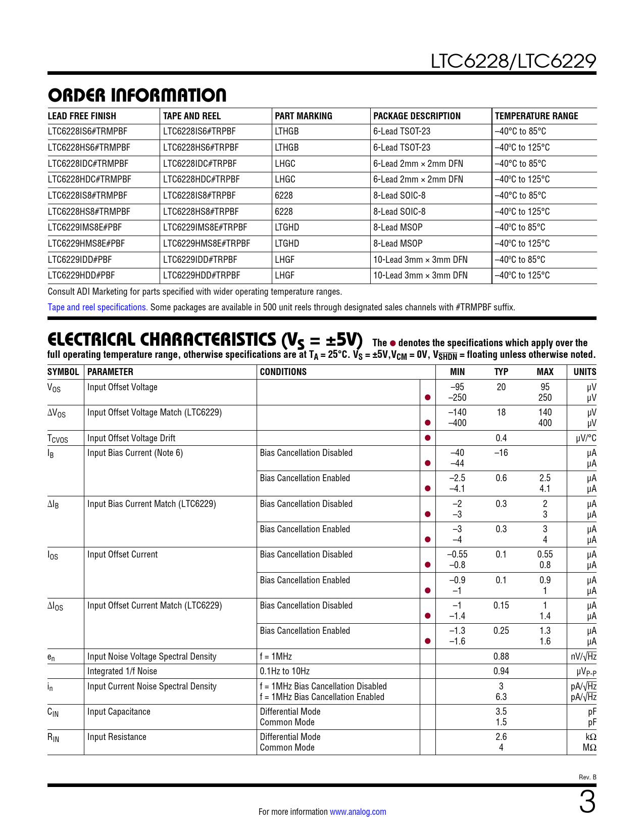 LTC6228IS6#TRMPBF LTC6228IS6#TRPBF LTHGB 6-Lead TSOT-23 –40°C to 85°C LTC6228HS6#TRMPBF LTC6228HS6#TRPBF LTHGB 6-Lead TSOT-23 –40ºC to 125°C LTC6228IDC#TRMPBF LTC6228IDC#TRPBF LHGC 6-Lead 2mm × 2mm DFN –40°C to 85°C LTC6228HDC#TRMPBF LTC6228HDC#TRPBF LHGC 6-Lead 2mm × 2mm DFN –40ºC to 125°C LTC6228IS8#TRMPBF LTC6228IS8#TRPBF 6228 8-Lead SOIC-8 –40°C to 85°C LTC6228HS8#TRMPBF LTC6228HS8#TRPBF 6228 8-Lead SOIC-8 –40ºC to 125°C LTC6229IMS8E#PBF LTC6229IMS8E#TRPBF LTGHD 8-Lead MSOP –40ºC to 85°C LTC6229HMS8E#PBF LTC6229HMS8E#TRPBF LTGHD 8-Lead MSOP –40ºC to 125°C LTC6229IDD#PBF LTC6229IDD#TRPBF LHGF 10-Lead 3mm × 3mm DFN –40ºC to 85°C LTC6229HDD#PBF LTC6229HDD#TRPBF LHGF 10-Lead 3mm × 3mm DFN –40ºC to 125°C Consult ADI Marketing for parts specified with wider operating temperature ranges. Tape and reel specifications. Some packages are available in 500 unit reels through designated sales channels with #TRMPBF suffix.