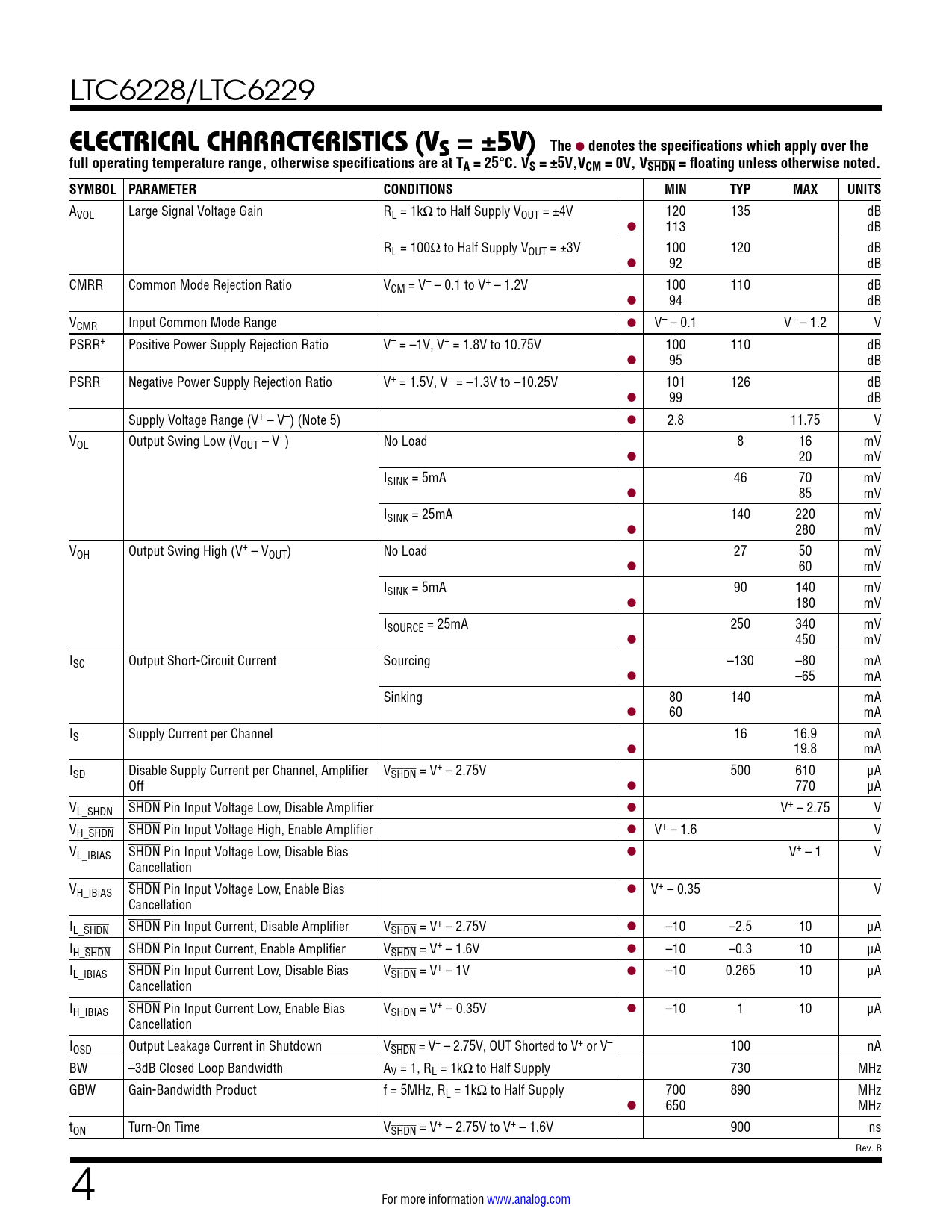 LTC6228/LTC6229 ELECTRICAL CHARACTERISTICS (VThe l denotes the specifications which apply over theS = ±5V)full operating temperature range, otherwise specifications are at TA = 25°C. VS = ±5V,VCM = 0V, VSHDN = floating unless otherwise noted. SYMBOL PARAMETERCONDITIONSMINTYPMAXUNITS AVOL Large Signal Voltage Gain RL = 1kΩ to Half Supply VOUT = ±4V 120 135 dB l 113 dB RL = 100Ω to Half Supply VOUT = ±3V 100 120 dB l 92 dB CMRR Common Mode Rejection Ratio VCM = V– – 0.1 to V+ – 1.2V 100 110 dB l 94 dB VCMR Input Common Mode Range l V– – 0.1 V+ – 1.2 V PSRR+ Positive Power Supply Rejection Ratio V– = –1V, V+ = 1.8V to 10.75V 100 110 dB l 95 dB PSRR– Negative Power Supply Rejection Ratio V+ = 1.5V, V– = –1.3V to –10.25V 101 126 dB l 99 dB Supply Voltage Range (V+ – V–) (Note 5) l 2.8 11.75 V VOL Output Swing Low (VOUT – V–) No Load 8 16 mV l 20 mV ISINK = 5mA 46 70 mV l 85 mV ISINK = 25mA 140 220 mV l 280 mV VOH Output Swing High (V+ – VOUT) No Load 27 50 mV l 60 mV ISINK = 5mA 90 140 mV l 180 mV ISOURCE = 25mA 250 340 mV l 450 mV ISC Output Short-Circuit Current Sourcing –130 –80 mA l –65 mA Sinking 80 140 mA l 60 mA IS Supply Current per Channel 16 16.9 mA l 19.8 mA ISD Disable Supply Current per Channel, Amplifier VSHDN = V+ – 2.75V 500 610 μA Off l 770 μA VL_SHDN SHDN Pin Input Voltage Low, Disable Amplifier l V+ – 2.75 V VH_SHDN SHDN Pin Input Voltage High, Enable Amplifier l V+ – 1.6 V VL_IBIAS SHDN Pin Input Voltage Low, Disable Bias l V+ – 1 V Cancellation VH_IBIAS SHDN Pin Input Voltage Low, Enable Bias l V+ – 0.35 V Cancellation IL_SHDN SHDN Pin Input Current, Disable Amplifier VSHDN = V+ – 2.75V l –10 –2.5 10 μA IH_SHDN SHDN Pin Input Current, Enable Amplifier VSHDN = V+ – 1.6V l –10 –0.3 10 μA IL_IBIAS SHDN Pin Input Current Low, Disable Bias VSHDN = V+ – 1V l –10 0.265 10 μA Cancellation IH_IBIAS SHDN Pin Input Current Low, Enable Bias VSHDN = V+ – 0.35V l –10 1 10 μA Cancellation IOSD Output Leakage Current in Shutdown VSHDN = V+ – 2.75V, OUT Shorted to V+ or V– 100 nA BW –3dB Closed Loop Bandwidth AV = 1, RL = 1kΩ to Half Supply 730 MHz GBW Gain-Bandwidth Product f = 5MHz, RL = 1kΩ to Half Supply 700 890 MHz l 650 MHz tON Turn-On Time VSHDN = V+ – 2.75V to V+ – 1.6V 900 ns Rev. B 4 For more information www.analog.com Document Outline Features Applications Typical Application Description Absolute Maximum Ratings Pin Configuration Order Information Electrical Characteristics (VS = ±5V) Electrical Characteristics (VS = 5V, 0V) Electrical Characteristics (VS = 3V, 0V) Typical Performance Characteristics Pin Functions Applications Information Typical Applications Package Description Revision History Typical Application Related Parts