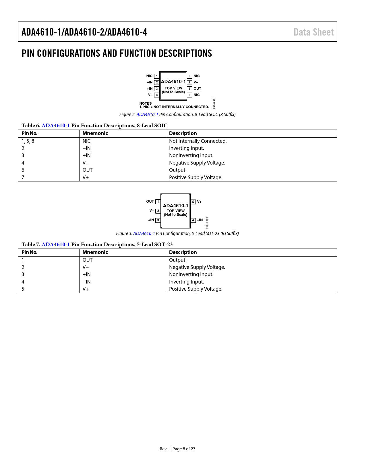 ADA4610-1/ADA4610-2/ADA4610-4. Data Sheet. PIN CONFIGURATIONS AND FUNCTION DESCRIPTIONS. NIC. –IN. ADA4610-1 7 V+. +IN. TOP VIEW. OUT
