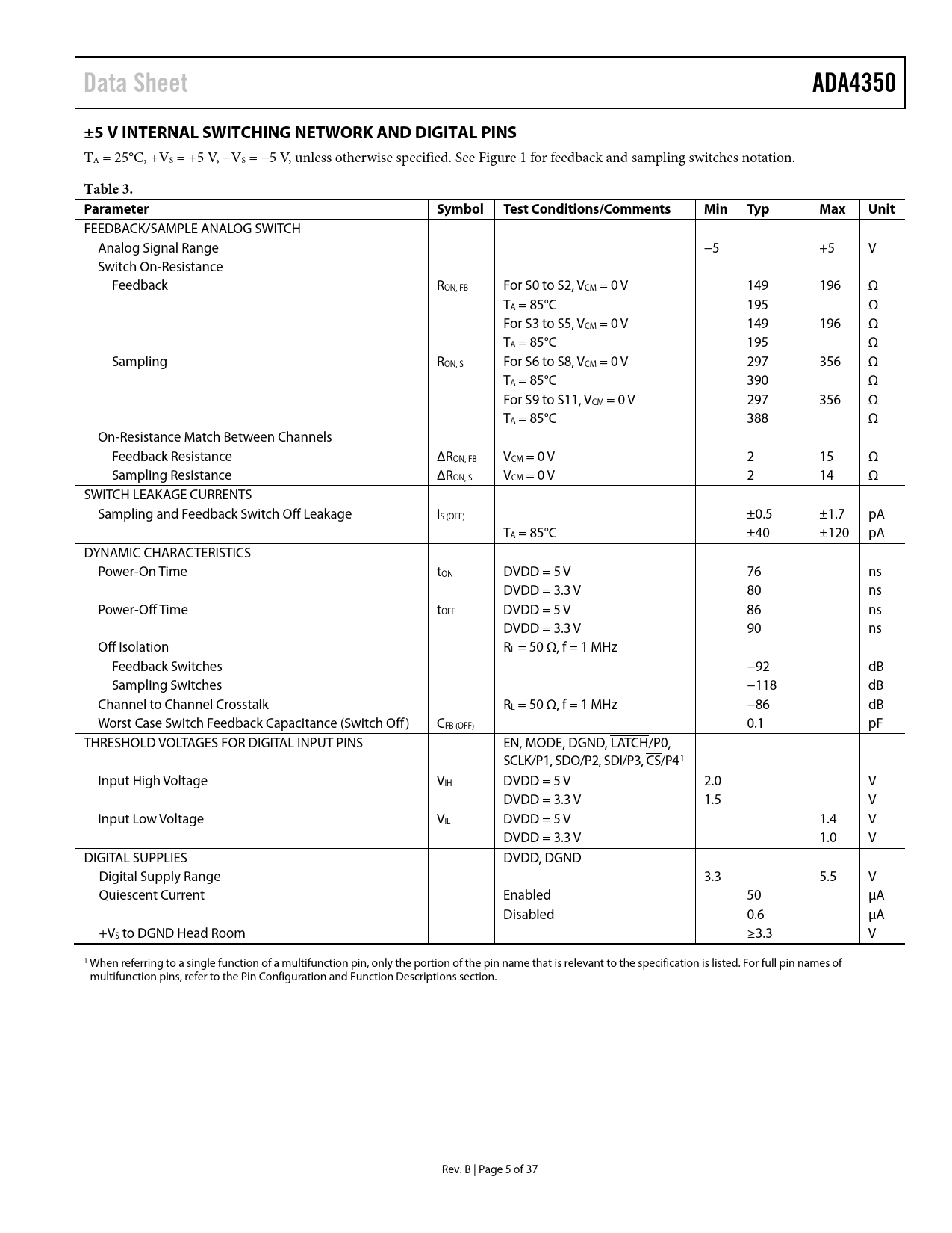 Data Sheet ADA4350 ±5 V INTERNAL SWITCHING NETWORK AND DIGITAL PINS Table 3 Parameter Symbol Test Conditions/Comments Min Typ