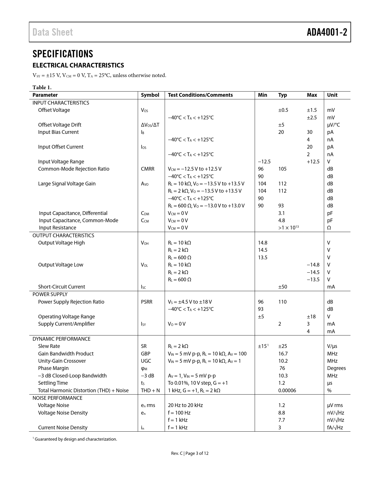 Pages / Page12 / 3 — Data Sheet. ADA4001-2. SPECIFICATIONS ELECTRICAL CHARACTERISTICS. Table …