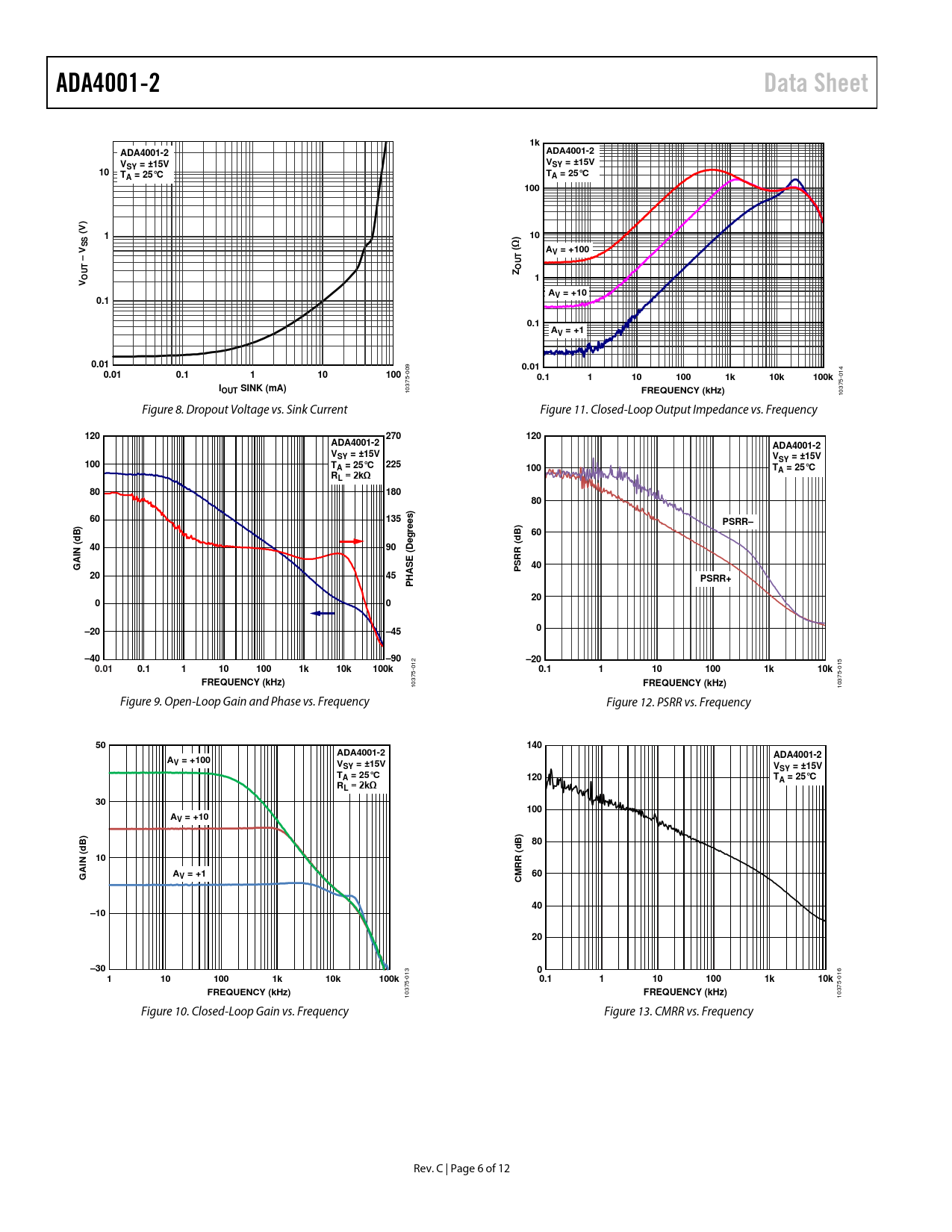ADA4001-2. Data Sheet. SY = ±15V. A = 25°C. 100. (V). (Ω). AV = +100. – V. UT O. AV = +10. 0.1. AV = +1. 0.01. 10k. 100k. IOUT SINK (mA). FREQUENCY (kHz)