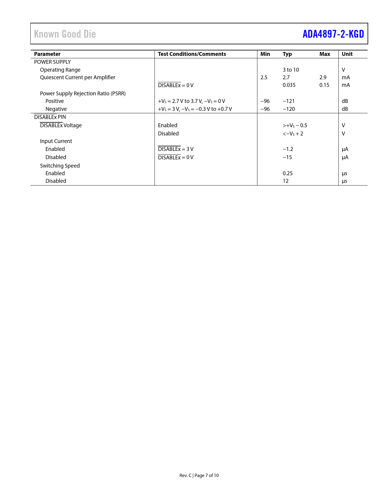Pages / Page10 / 7 — Known Good Die. ADA4897-2-KGD. Parameter. Test Conditions/Comments. Min. …