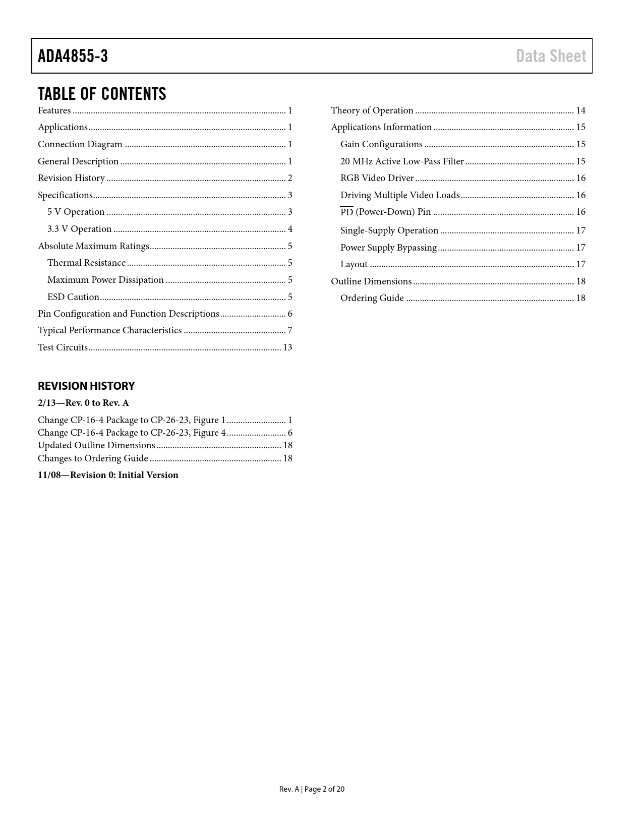 Pages / Page20 / 2 — ADA4855-3. Data Sheet. TABLE OF CONTENTS. REVISION HISTORY 2/13—Rev. 0 to …