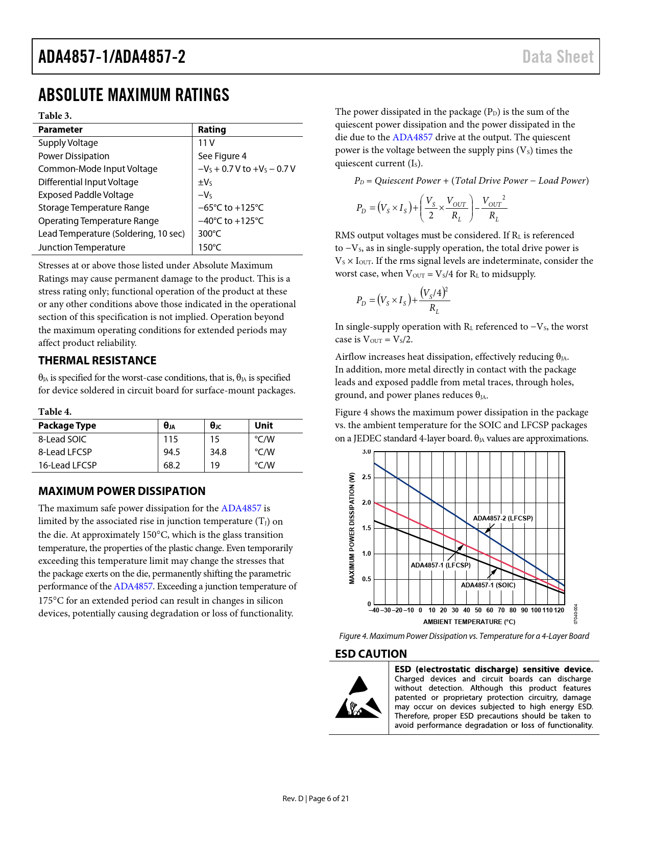 ADA4857-1/ADA4857-2. Data Sheet. ABSOLUTE MAXIMUM RATINGS Table 3. Parameter. Rating. THERMAL RESISTANCE. Table 4. Package Type. θJA. θJC