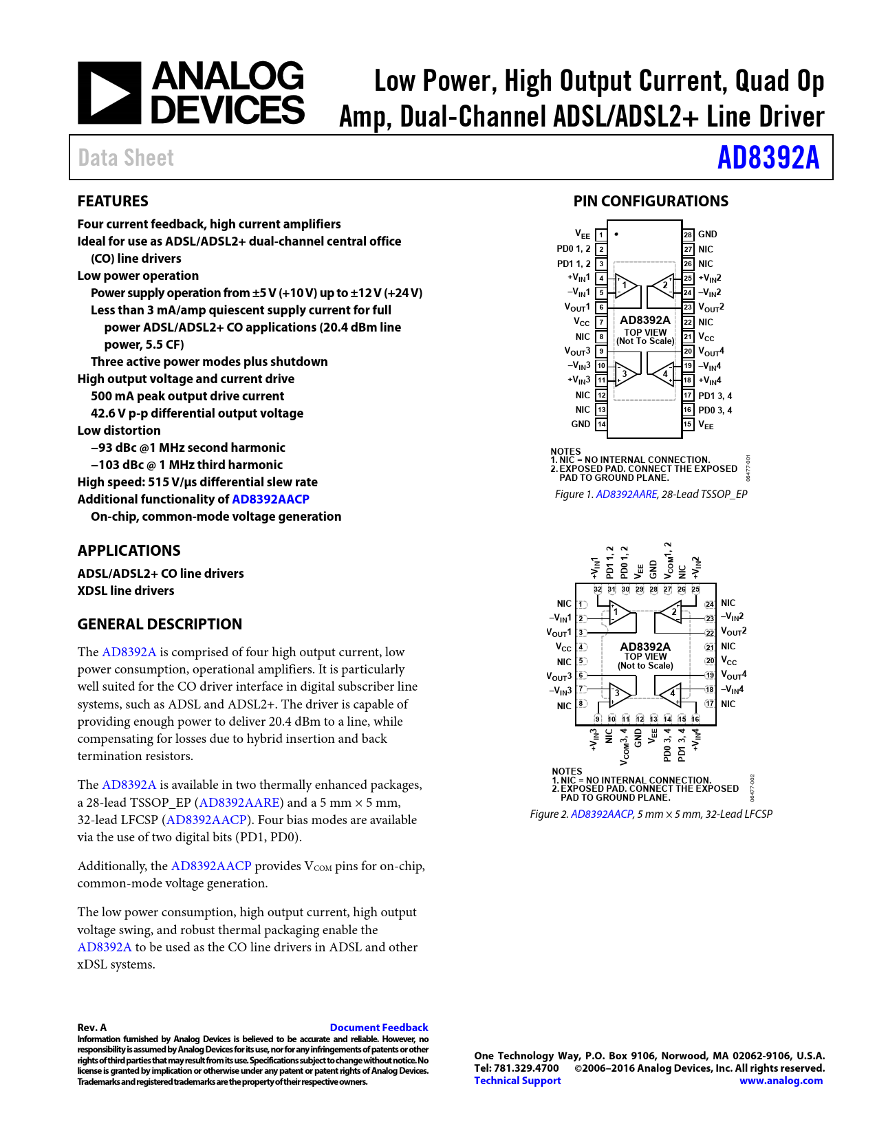 The AD8392A is available in two thermally enhanced packages,