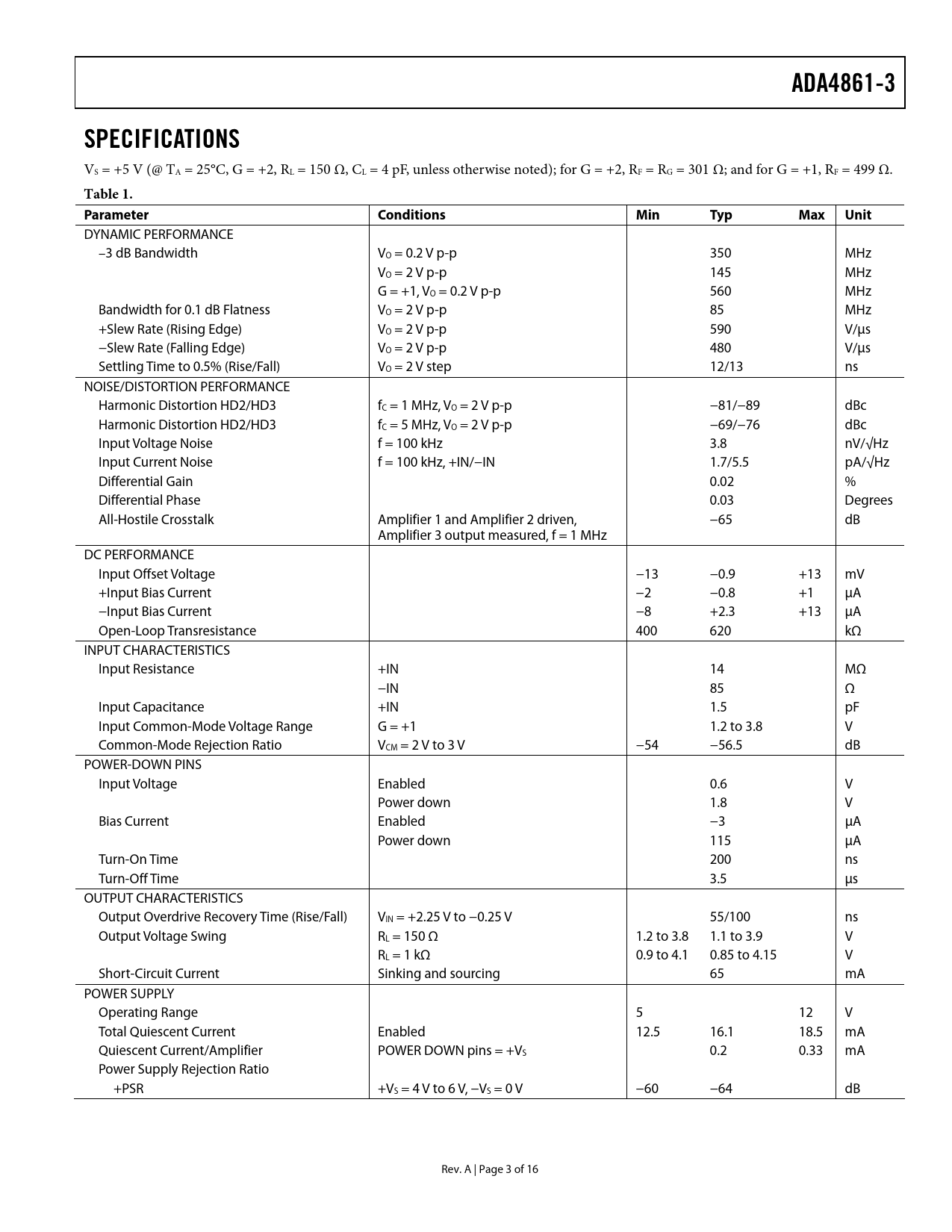 ADA4861-3SPECIFICATIONS VS = +5 V (@ TA = 25°C, G = +2, RL = 150 Ω, CL = 4 pF, unless otherwise noted); for G = +2, RF = RG = 301 Ω; and for G = +1, RF = 499 Ω. Table 1. Parameter ConditionsMinTypMaxUnit DYNAMIC PERFORMANCE –3 dB Bandwidth VO = 0.2 V p-p 350 MHz VO = 2 V p-p 145 MHz G = +1, VO = 0.2 V p-p 560 MHz Bandwidth for 0.1 dB Flatness VO = 2 V p-p 85 MHz +Slew Rate (Rising Edge) VO = 2 V p-p 590 V/μs −Slew Rate (Falling Edge) VO = 2 V p-p 480 V/μs Settling Time to 0.5% (Rise/Fall) VO = 2 V step 12/13 ns NOISE/DISTORTION PERFORMANCE Harmonic Distortion HD2/HD3 fC = 1 MHz, VO = 2 V p-p −81/−89 dBc Harmonic Distortion HD2/HD3 fC = 5 MHz, VO = 2 V p-p −69/−76 dBc Input Voltage Noise f = 100 kHz 3.8 nV/√Hz Input Current Noise f = 100 kHz, +IN/−IN 1.7/5.5 pA/√Hz Differential Gain 0.02 % Differential Phase 0.03 Degrees All-Hostile Crosstalk Amplifier 1 and Amplifier 2 driven, −65 dB Amplifier 3 output measured, f = 1 MHz DC PERFORMANCE Input Offset Voltage −13 −0.9 +13 mV +Input Bias Current −2 −0.8 +1 μA −Input Bias Current −8 +2.3 +13 μA Open-Loop Transresistance 400 620 kΩ INPUT CHARACTERISTICS Input Resistance +IN 14 MΩ −IN 85 Ω Input Capacitance +IN 1.5 pF Input Common-Mode Voltage Range G = +1 1.2 to 3.8 V Common-Mode Rejection Ratio VCM = 2 V to 3 V −54 −56.5 dB POWER-DOWN PINS Input Voltage Enabled 0.6 V Power down 1.8 V Bias Current Enabled −3 μA Power down 115 μA Turn-On Time 200 ns Turn-Off Time 3.5 μs OUTPUT CHARACTERISTICS Output Overdrive Recovery Time (Rise/Fall) VIN = +2.25 V to −0.25 V 55/100 ns Output Voltage Swing RL = 150 Ω 1.2 to 3.8 1.1 to 3.9 V RL = 1 kΩ 0.9 to 4.1 0.85 to 4.15 V Short-Circuit Current Sinking and sourcing 65 mA POWER SUPPLY Operating Range 5 12 V Total Quiescent Current Enabled 12.5 16.1 18.5 mA Quiescent Current/Amplifier POWER DOWN pins = +VS 0.2 0.33 mA Power Supply Rejection Ratio +PSR +VS = 4 V to 6 V, −VS = 0 V −60 −64 dB Rev. A | Page 3 of 16 Document Outline FEATURES APPLICATIONS PIN CONFIGURATION GENERAL DESCRIPTION TABLE OF CONTENTS REVISION HISTORY SPECIFICATIONS ABSOLUTE MAXIMUM RATINGS THERMAL RESISTANCE Maximum Power Dissipation ESD CAUTION TYPICAL PERFORMANCE CHARACTERISTICS APPLICATIONS GAIN CONFIGURATIONS 20 MHz ACTIVE LOW-PASS FILTER RGB VIDEO DRIVER DRIVING TWO VIDEO LOADS POWER-DOWN PINS SINGLE-SUPPLY OPERATION POWER SUPPLY BYPASSING LAYOUT OUTLINE DIMENSIONS ORDERING GUIDE