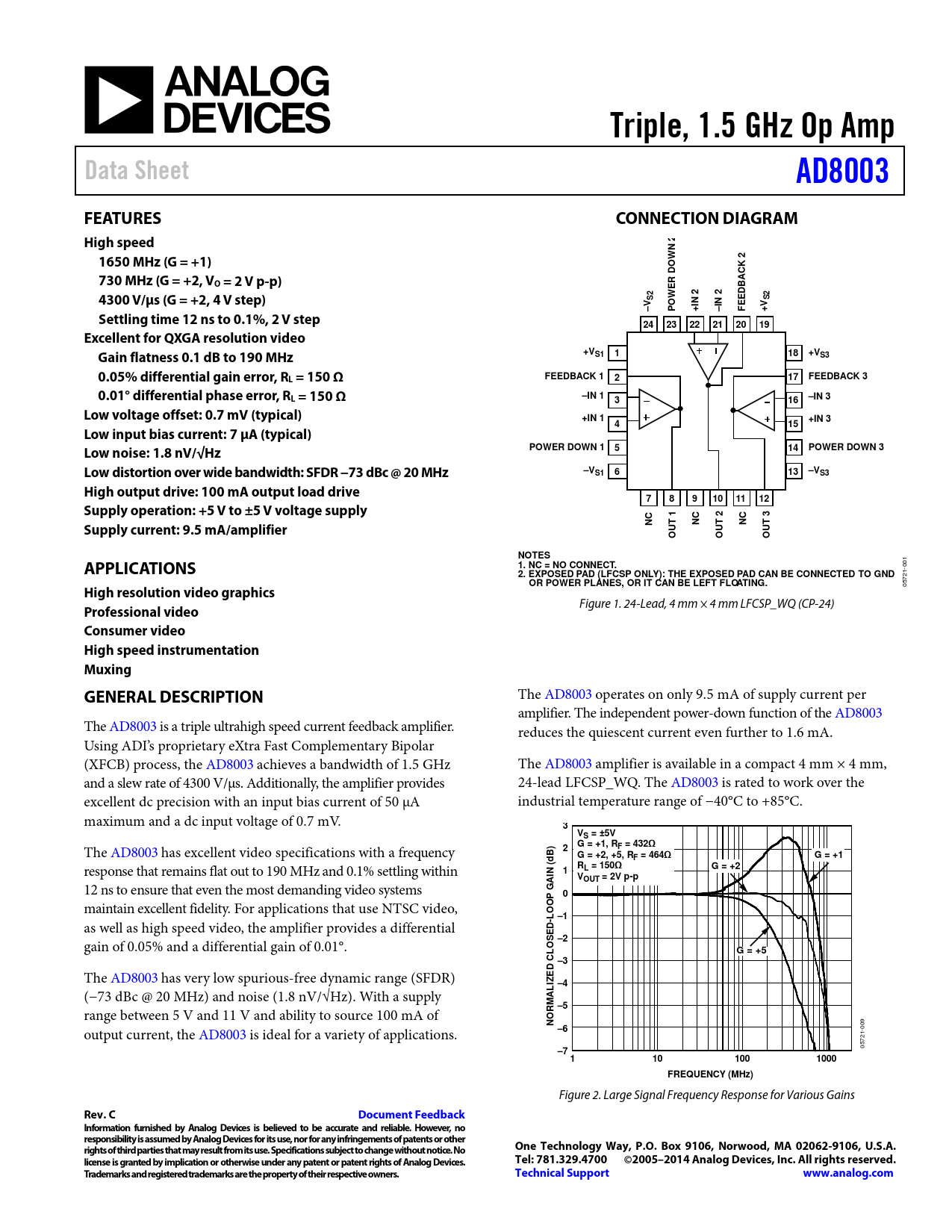 The AD8003 operates on only 9.5 mA of supply current per amplifier. The independent power-down function of the AD8003 The AD8003 is a triple ultrahigh speed current feedback amplifier. reduces the quiescent current even further to 1.6 mA. Using ADI’s proprietary eXtra Fast Complementary Bipolar (XFCB) process, the AD8003 achieves a bandwidth of 1.5 GHz The AD8003 amplifier is available in a compact 4 mm × 4 mm, and a slew rate of 4300 V/µs. Additional y, the amplifier provides 24-lead LFCSP_WQ. The AD8003 is rated to work over the excellent dc precision with an input bias current of 50 µA industrial temperature range of −40°C to +85°C. maximum and a dc input voltage of 0.7 mV.
