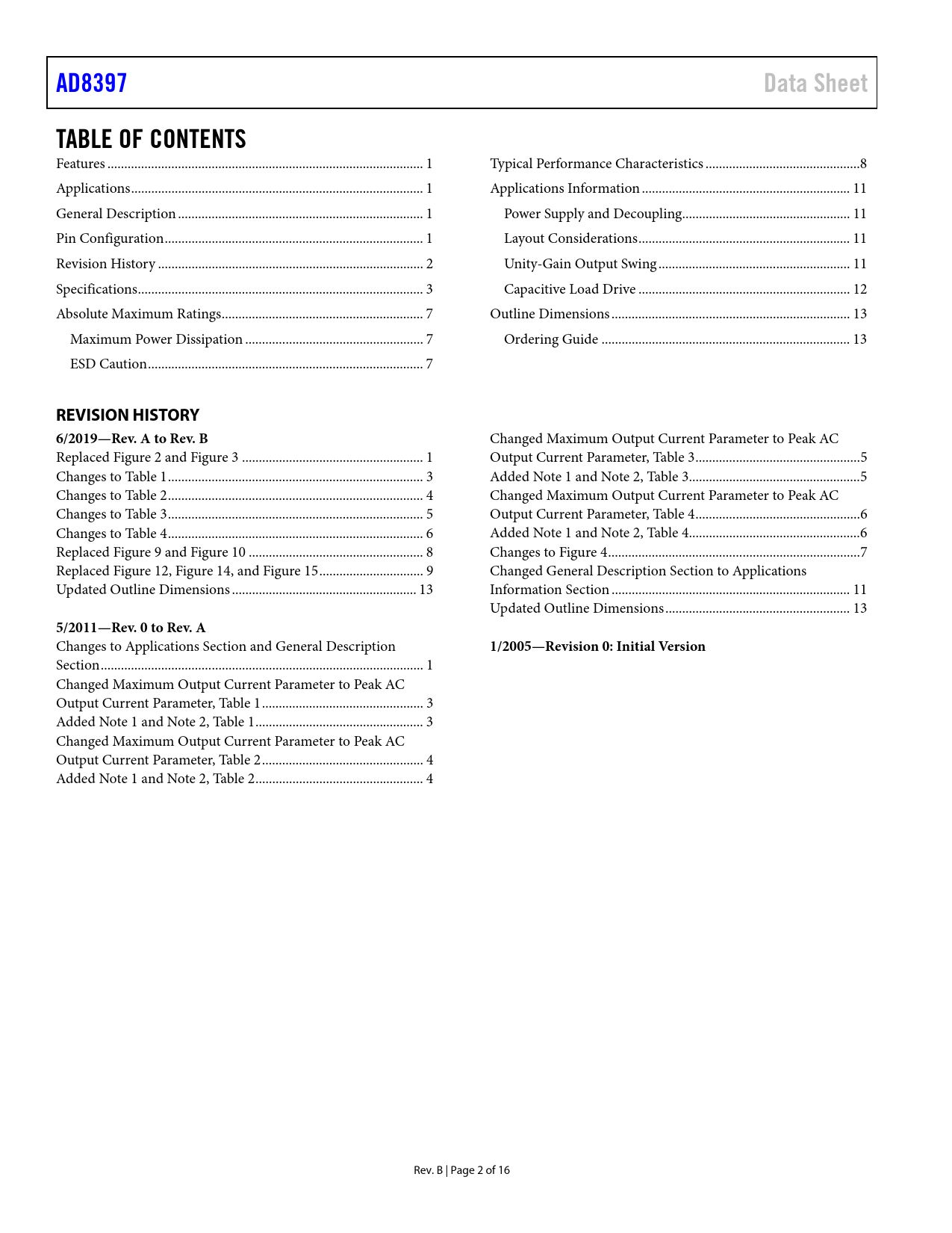 Pages / Page16 / 2 — AD8397. Data Sheet. TABLE OF CONTENTS. REVISION HISTORY. 6/2019—Rev. A to …