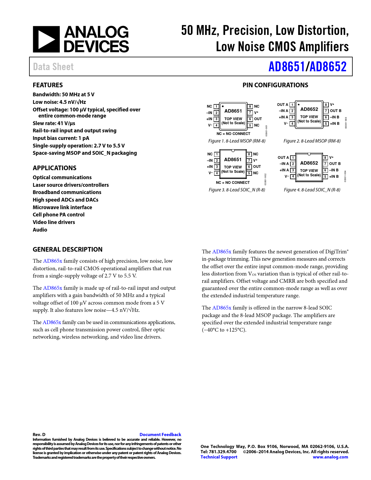 50 MHz, Precision, Low Distortion,. Low Noise CMOS Amplifiers. Data Sheet. AD8651/. AD8652. FEATURES. PIN CONFIGURATIONS