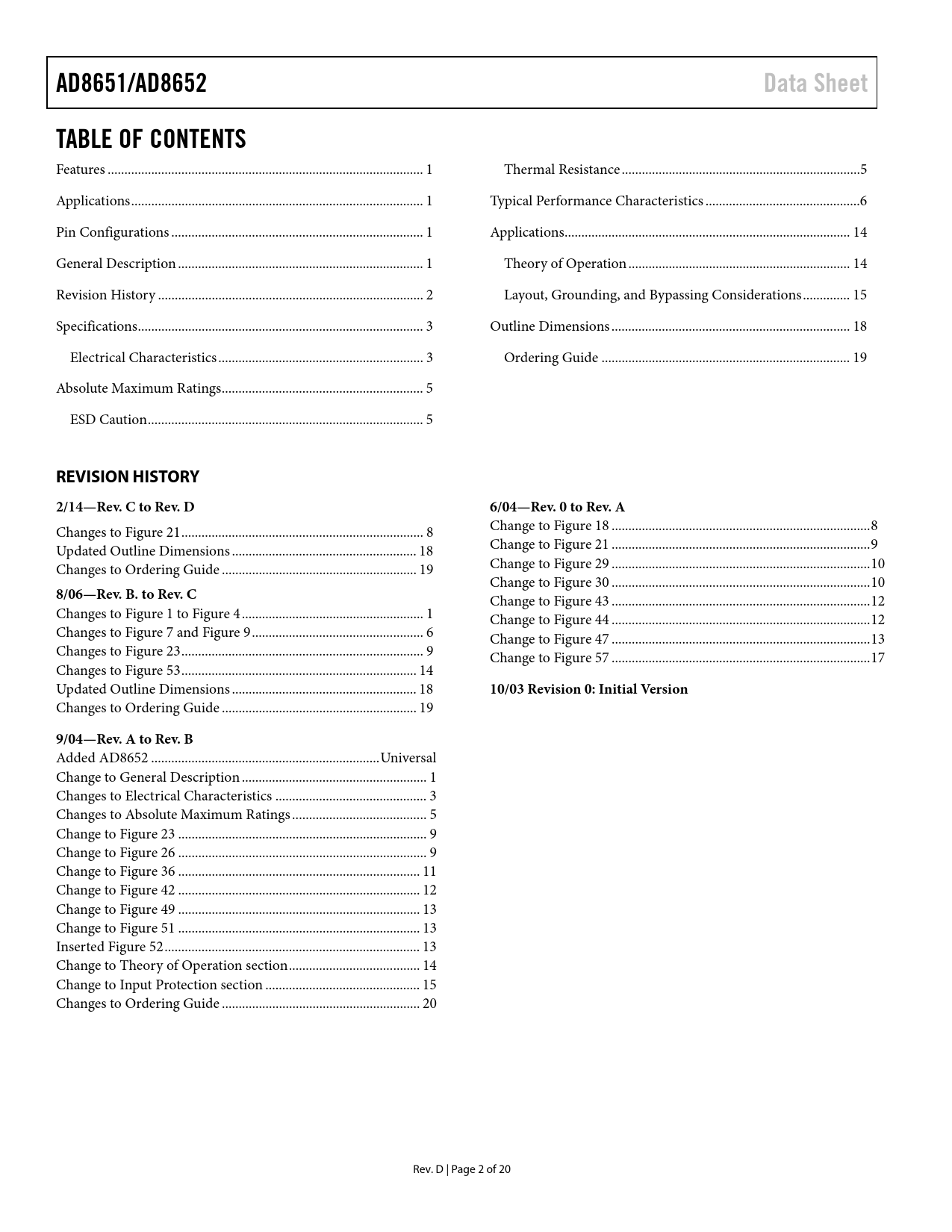 Pages / Page20 / 2 — AD8651/AD8652. Data Sheet. TABLE OF CONTENTS. REVISION HISTORY. 2/14—Rev. …