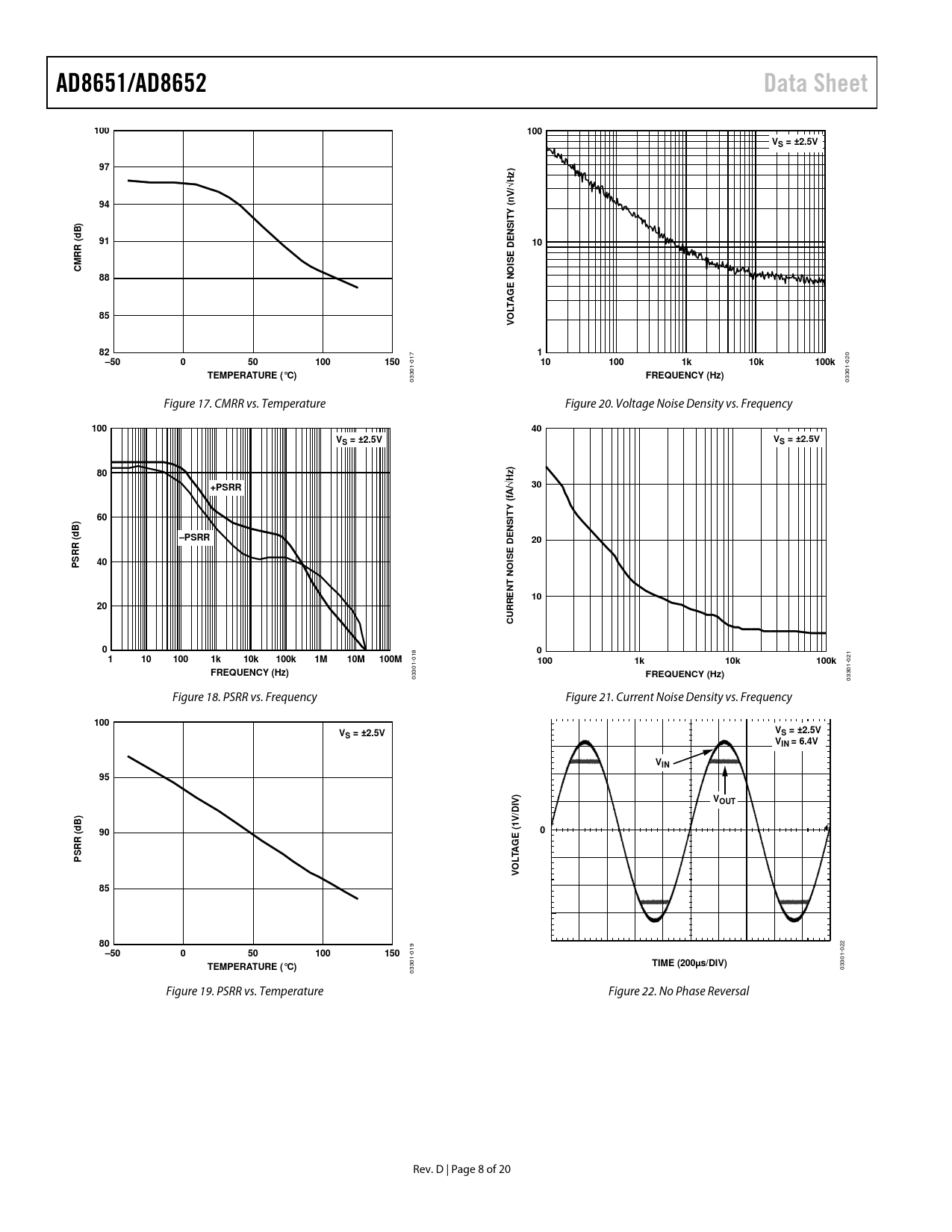 AD8651/AD8652Data Sheet100100VS = ±2.5V97z) √H V/94(nYTB)SId91EN10RR (ISE DCMO88E N G A LT85VO821–50050100150 017 101001k10k100k 020 TEMPERATURE (°C)FREQUENCY (Hz) 03301- 03301- Figure 17. CMRR vs. Temperature Figure 20. Voltage Noise Density vs. Frequency 10040VS = ±2.5VVS = ±2.5V80z)+PSRR/√H30(fAY60ITB)NSd–PSRRDE20RR (ESISP40NO NT1020CURRE001101001k10k100k1M10M100M 018 1001k10k100k 021 FREQUENCY (Hz)FREQUENCY (Hz) 03301- 03301- Figure 18. PSRR vs. Frequency Figure 21. Current Noise Density vs. Frequency 100VVS = ±2.5VS = ±2.5VVIN = 6.4VVIN95VOUTIV) DB)V/d900E (1RR (GSAPLTVO8580 022 –50050100150 019 TEMPERATURE (°C)TIME (200µs/DIV) 03301- 03301- Figure 19. PSRR vs. Temperature Figure 22. No Phase Reversal Rev. D | Page 8 of 20 Document Outline Features Applications Pin Configurations General Description Table of Contents Revision History Specifications Electrical Characteristics Absolute Maximum Ratings ESD Caution Thermal Resistance Typical Performance Characteristics Applications Theory of Operation Rail-to-Rail Output Stage Rail-to-Rail Input Stage Input Protection Overdrive Recovery Layout, Grounding, and Bypassing Considerations Power Supply Bypassing Grounding Leakage Currents Input Capacitance Output Capacitance Settling Time THD Readings vs. Common-Mode Voltage Driving a 16-Bit ADC Outline Dimensions Ordering Guide