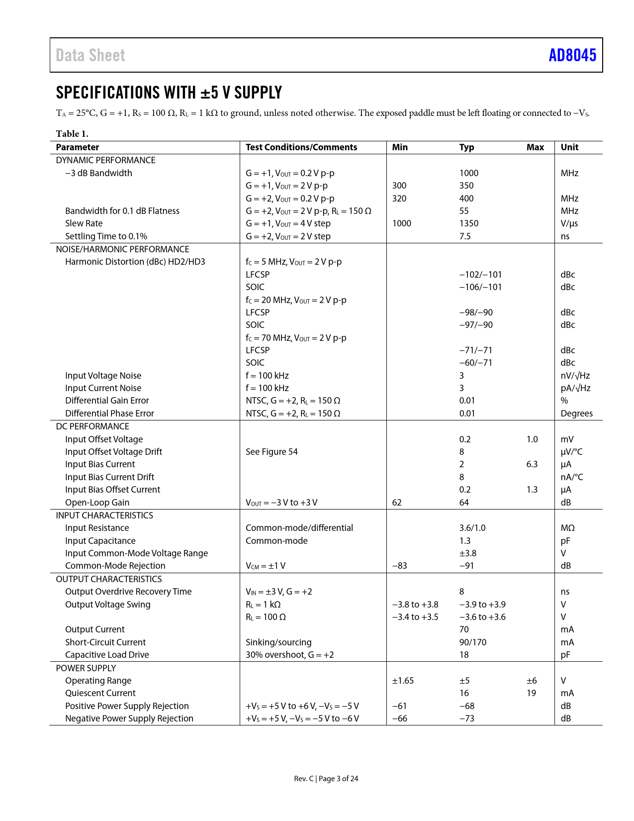 Pages / Page24 / 3 — Data Sheet. AD8045. SPECIFICATIONS WITH ±5 V SUPPLY. Table 1. Parameter. …