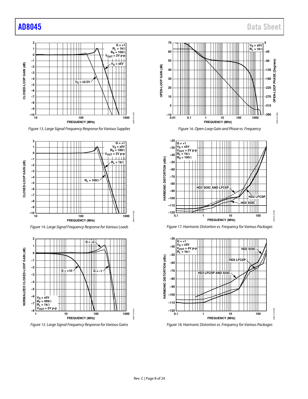 04814-0-042 04814-0-030 Figure 14. Large Signal Frequency Response for Various Loads Figure 17. Harmonic Distortion vs. Frequency for Various Packages